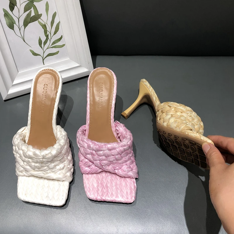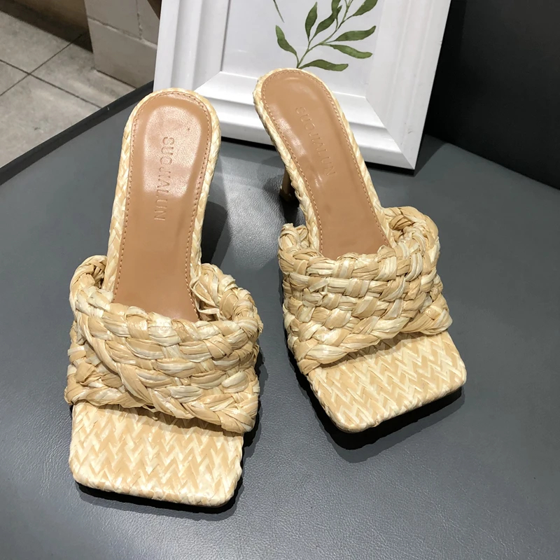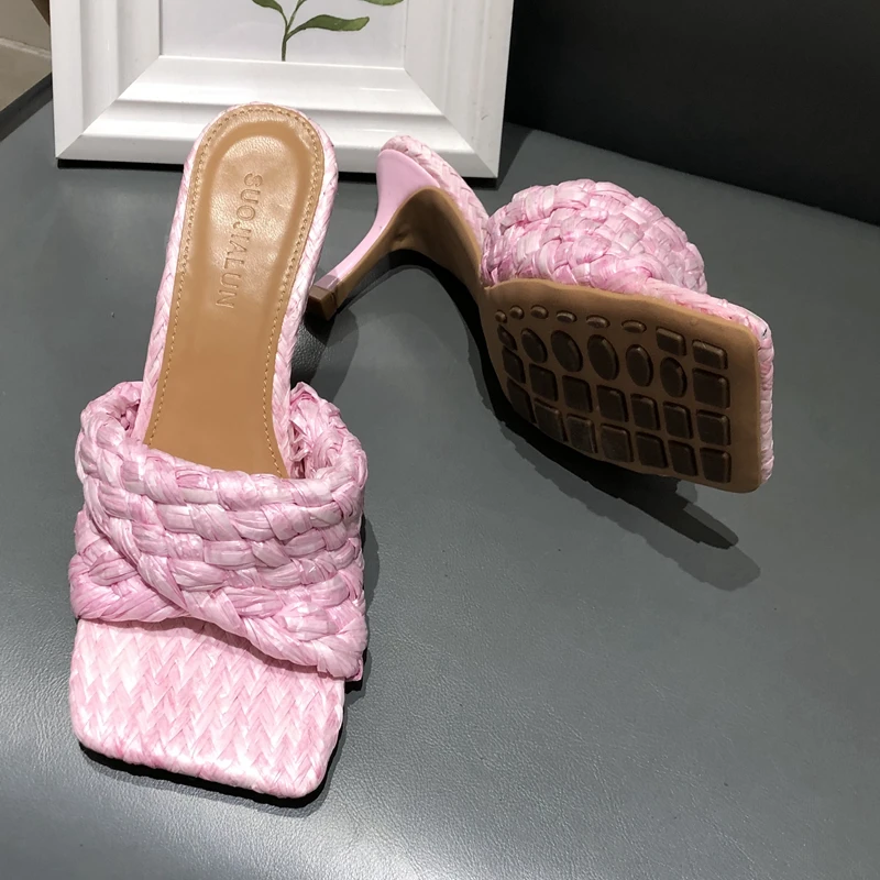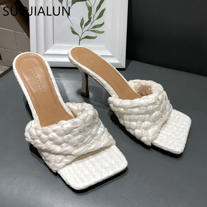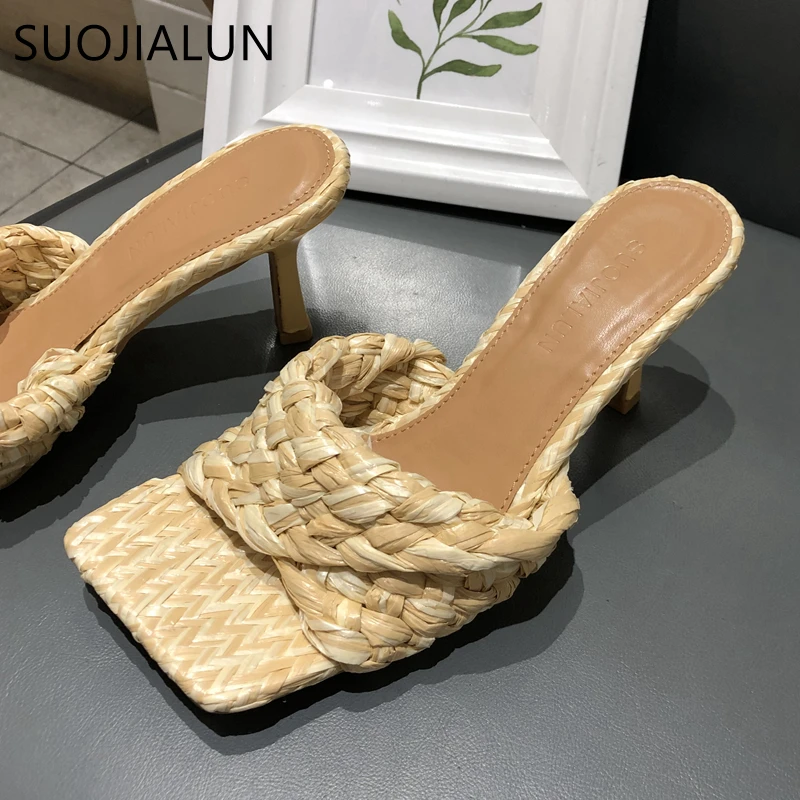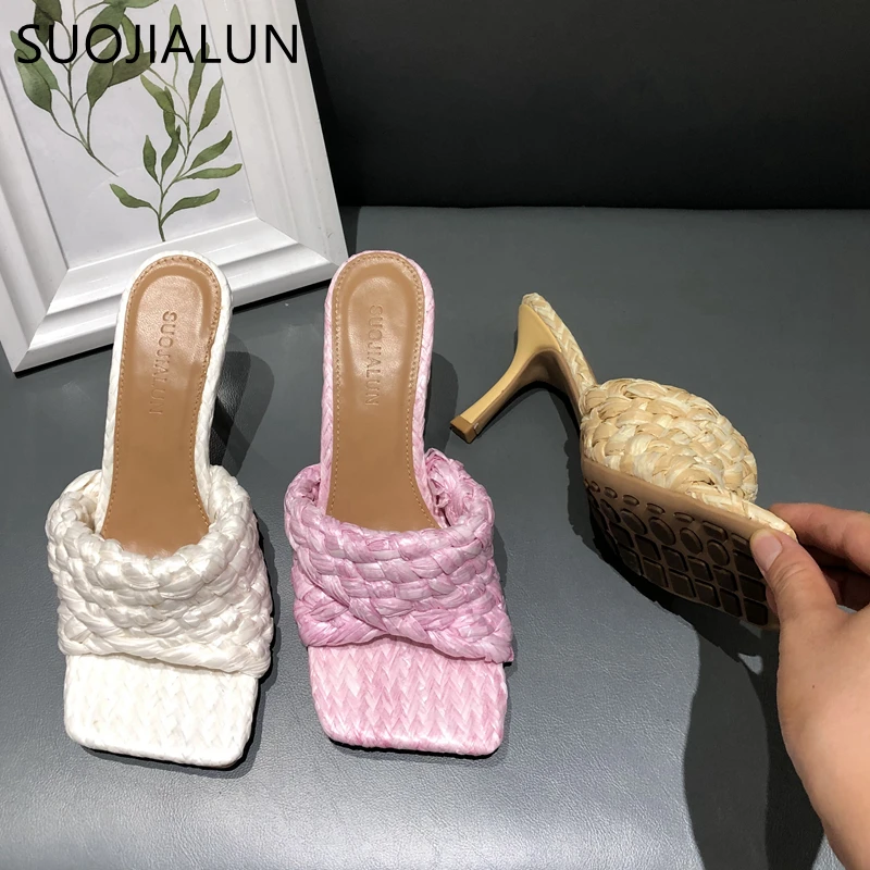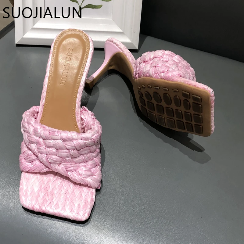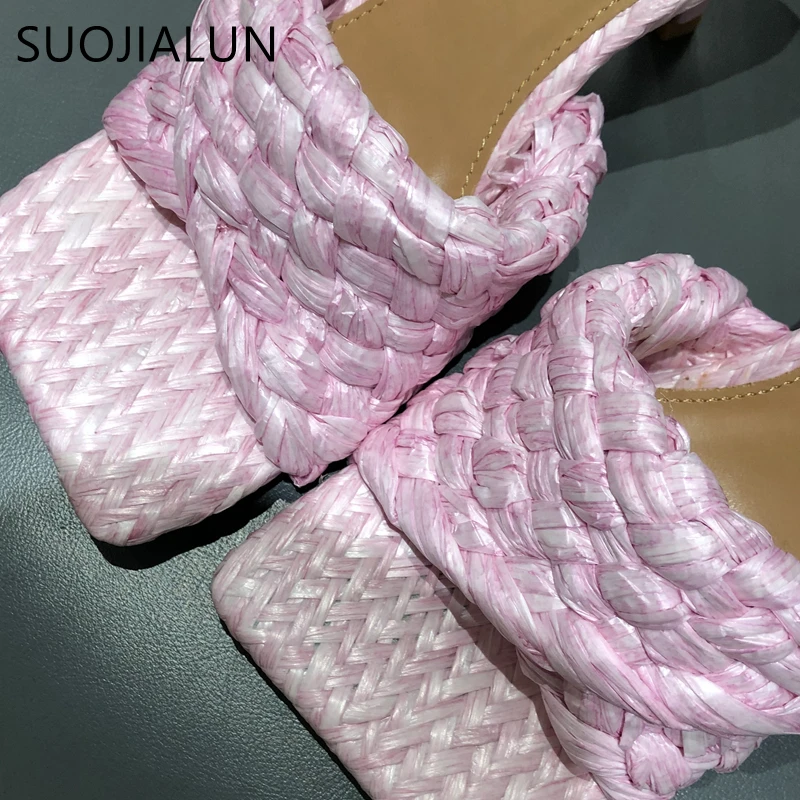 Шлепанцы женские SUOJIALUN, летние, с переплетением, с квадратным носком, на высоком каблуке, 2021