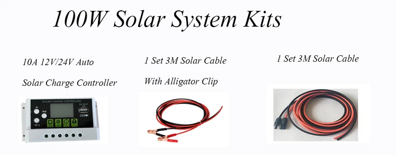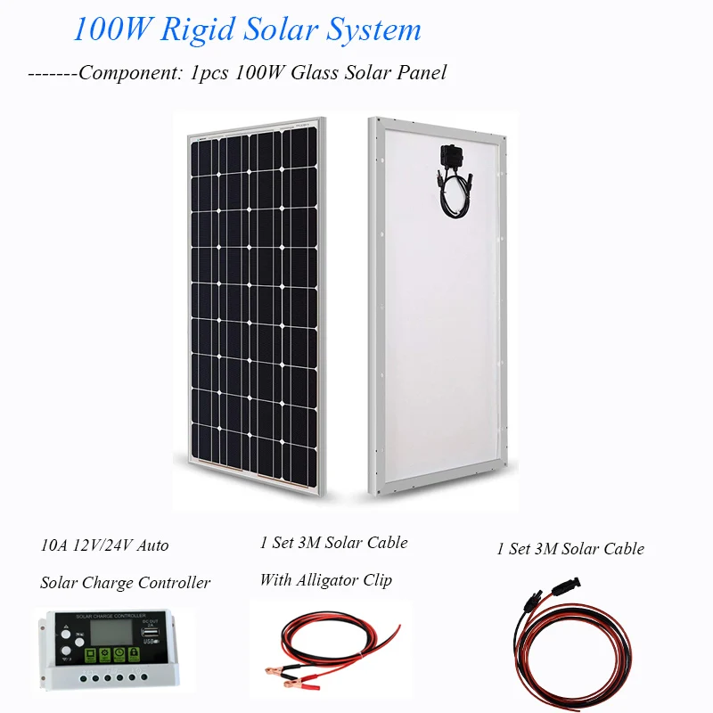 1, жесткая стеклянная солнечная панель 100 Вт 18 В, 1 шт.; Размер: 1165 мм * 552 мм * 30 мм. 2, 10A, 12V/24V режимы Auto, pwm контроллер солнечного заряда; 1 шт. 3, 3 м Удлинительный Солнечный Кабель; Красный и черный; 1 комплект; 4, 3 м кабель подключения аккумулятора; 1 комплект