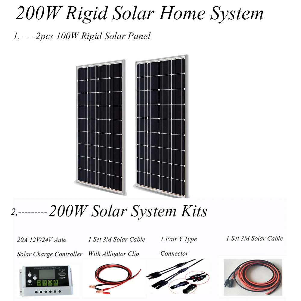 1, жесткая стеклянная солнечная панель 100 Вт 18 в, 2 шт.; Размер: 1165 мм * 552 мм * 30 мм. 2, 20A, 12V/24V режимы Auto, pwm контроллер солнечного заряда; 1 шт. 3, Солнечный Кабель типа Y; Женский и мужской; 1 комплект; 4, 3 м Удлинительный Солнечный Кабель; Красный и черный; 1 комплект; 5, 3 м кабель подключения аккумулятора; 1 комплект