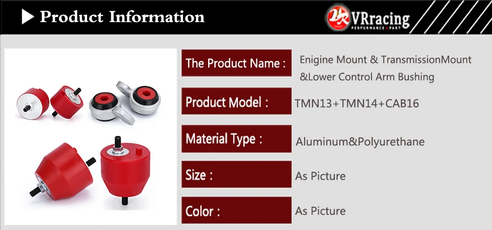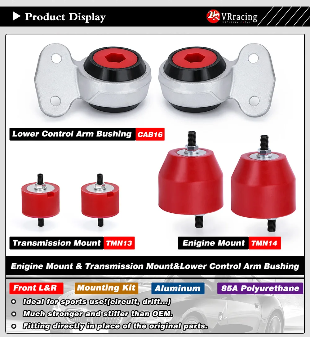 100% гарантия качества протестирована, более отзывчива, дешевле, проще в установке.Надеюсь, у вас никогда не будет удара или жесткости, так как это почти всегда приводит к сломанным креплениям двигателя, трещинам креплению на уши или хуже.Идеально подходит для занятий спортом! (цепь, дрифт...)Установка непосредственно на месте оригинальных деталей.Намного прочнее и жестче, чем OEM.Может быть uesd в E30 S50 или M50.Материал и цвет: