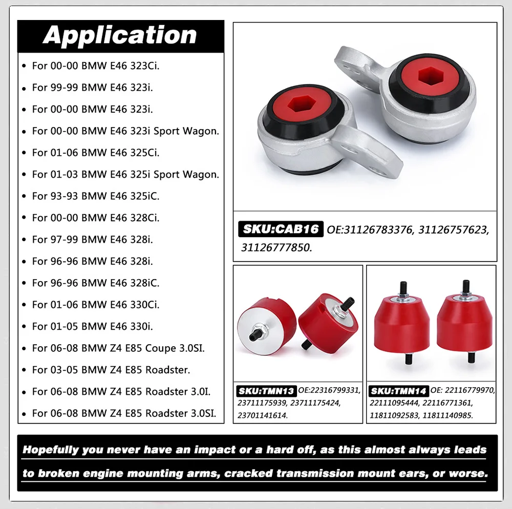 TMN13 + TMN14 OE номер: 22116779970, 22111095444, 22116771361, 11811092583, 11811140985. (Также EM-9003, 603820, 538631) TMN13 + TMN14Общие для BMW номера частей, которые заменяют эти транс-крепления: 22316799331, 23711175939, 23711175424, 23701141614.