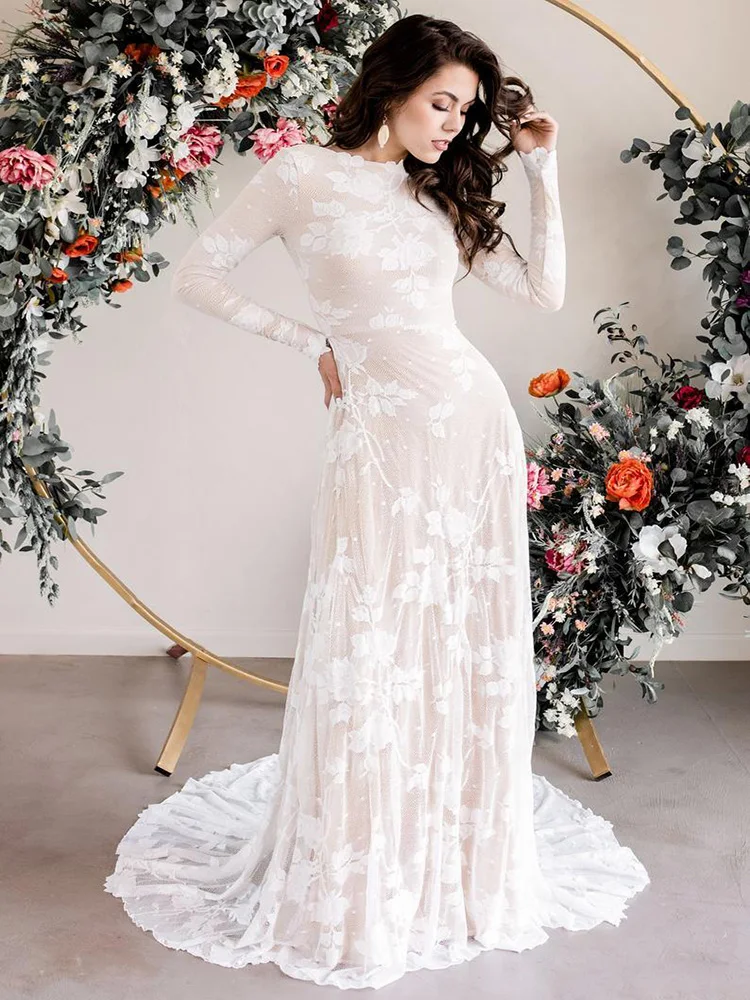 Винтаж полные кружевные свадебные платья с подкладкой телесного цвета 2020 прозрачная одежда с длинным рукавом, с бисером, открытая спина, без бретелек, свадебные платья Boho
