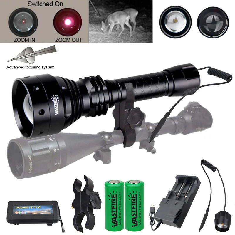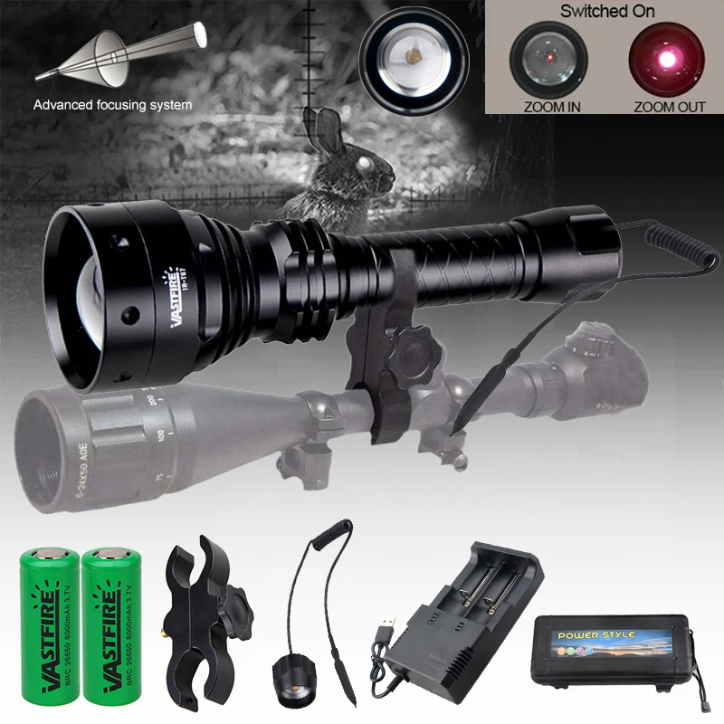 Лазерный ИК 850nm Ночное видение прицел оружие светильник 800 ярдов Масштабируемые инфракрасный Охота вспышки светильник + переключатель + 2*26650 + крепление + Зарядное устройство