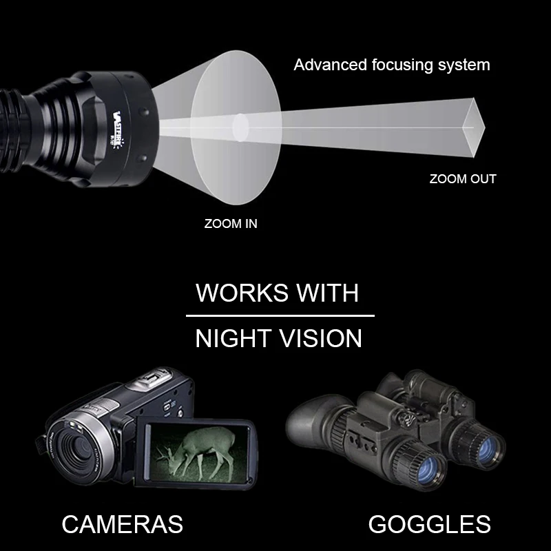 * Невидимый ИК светильник: VASTFIRE T67 не является обычным флэш-светильник с белый светодиодный для общего светильник ing цели. Используя лазерный инфракрасный светильник, черный светодиодный излучатель 850nm, VASTFIRE T67 излучает Невидимый, но высокомощный ИК-светильник с более чем 10 ваттами оптической мощности. (Только маленький и слабый красный светодиодный фонарь, чтобы показать вам, что фонарь включен).T67 850NM IR охотничий фонарик Спецификация:Бренд: VastfireМодель: T67Дальность освещения: 50-800 ярдовСветодиодный: Лазерный Инфракрасный 850 нмASPERICAL объектив: 70 мм объективРежим: 1 режим от высокогоАккумулятор: 2 аккумулятора 18650 или 2 аккумулятора 26650 (CR123A не подходит; Аккумулятор не входит в комплект)Батареи Вход Напряжение: 7,4-8,4 VВодонепроницаемость: только защита от брызгДиаметр корпуса: 30 мм (подходит для любого кольца 30 мм или крепления)Материал изделия: алюминиевый сплавЦвет: черныйРазмеры: 228 мм (уменьшение зума 23 мм) (длина) / 70 мм (головка) / 30 мм (корпус) / 39 мм (хвост)