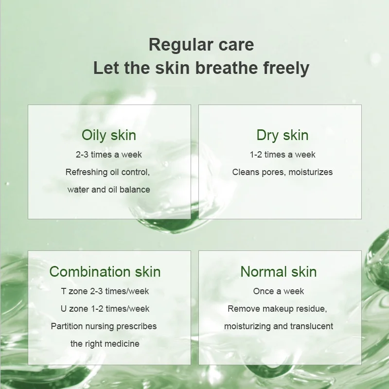 Однотонная Очищающая маска зеленого чая содержит экстракт зеленого чая, который может эффективно очищать поры кожи, глубоко очищать кожу от грязи, регулировать водный и масляный баланс кожи, восстанавливать влагу кожи, И питает кожу.