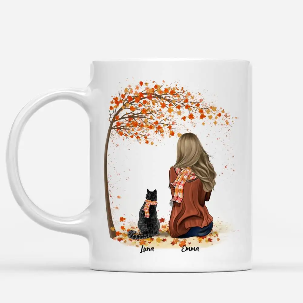 Девушка и кошка собака Осеннее дерево персонализированные кружки лу...