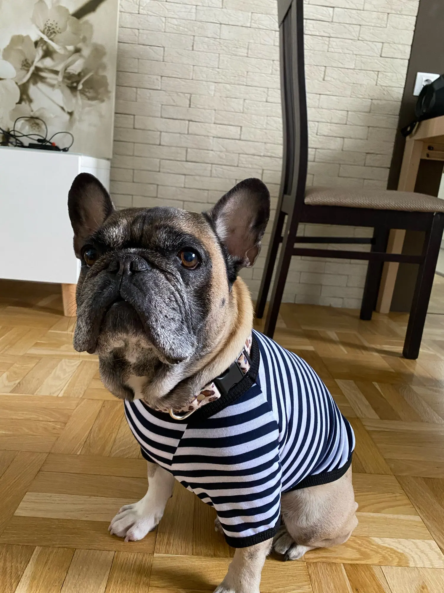 Быстрая доставка. Рубашка хорошего качества, выглядит так хорошо на моем французском бульдоге!