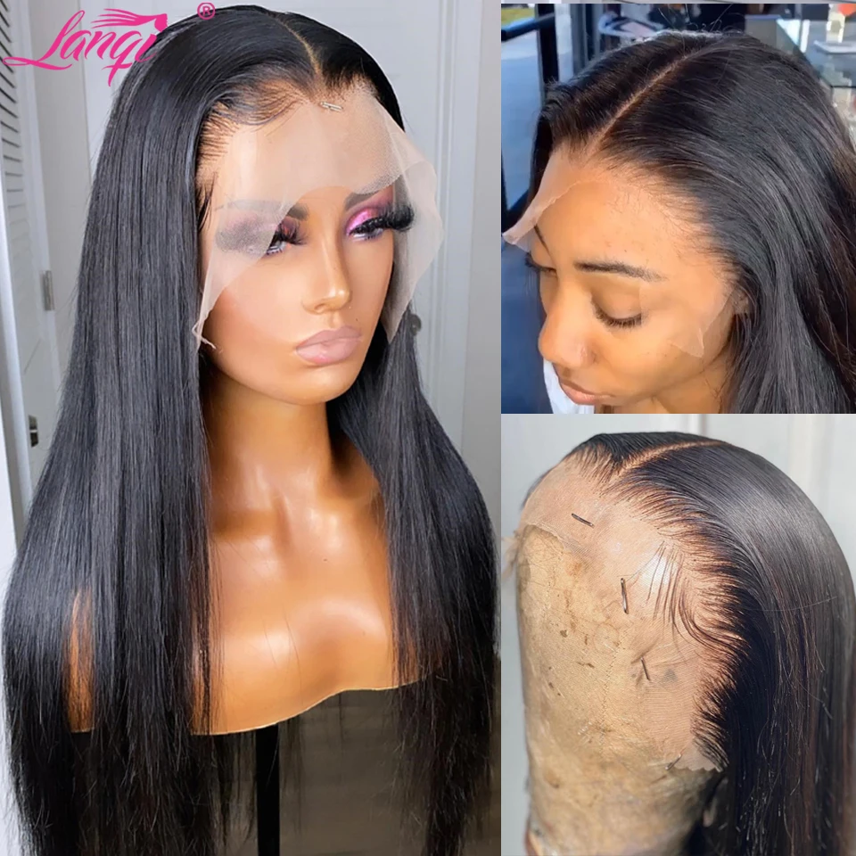 Lanqi оптовая продажа, 30 дюймов, прямой парик на шнурке спереди, 4x4, парик с закрытием, бразильские парики из натуральных волос на шнурке для женщин, парик с Т-образной частью