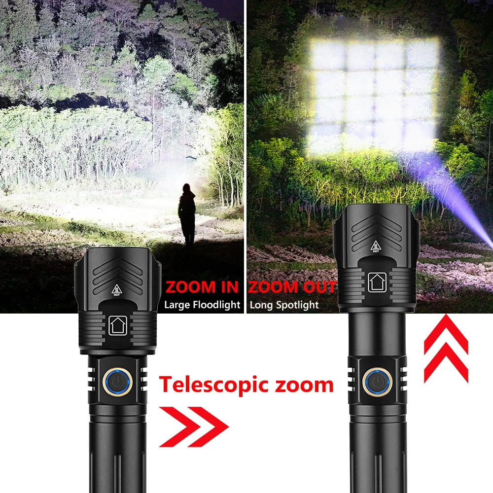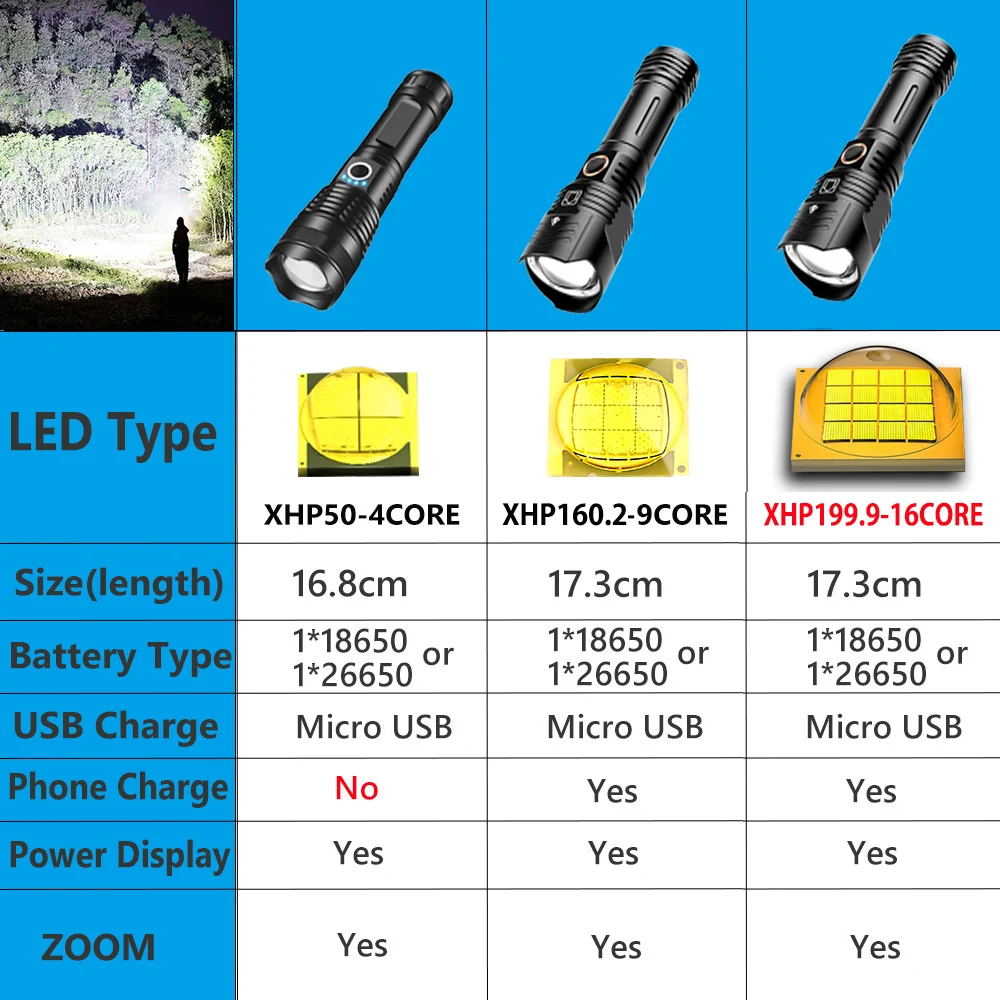 Мощный светодиодный фонарик XHP199.9, 18650 лм, 16 ядер, водонепроницаемый, IPX5, масштабируемый фонарь, 5 режимов, USB, перезаряжаемая лампа с батареей 26650