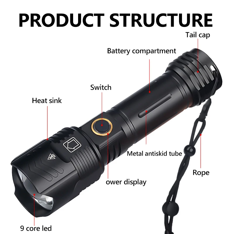 Модель лампы: XHP199.9/XHP160.2Светодиодный: 16 ядер/9 ядерМатериал линз: оптические линзыРабочая передача: 5 передач (сильный, средний, слабый, быстрый мигание, медленное мигание)Размер продукта: 17,3*4,8*3,5 смПрименимые батареи: 26650*1/18650*1/AAA * 3 (без аккумулятора)(Примечание: без батарей)Время освещения: аккумулятор 18650 3-4 часа; Аккумулятор 26650: 5-10 часов.Лампа/светодиодный срок службы: 100000 часовВодонепроницаемость: IPX5Мощность продукта: 500 ВтМатериал изделия: T6063-T6 авиационный алюминий.Рабочее напряжение: 3,7 VДиапазон: 600-1000 метровЦвет изделия: черныйПрямая зарядка: Прямая зарядка через USB (с выходом и двойным входом)Зум: Телескопический фокусПоложение переключателя: Средний кнопочный переключательДисплей питания: 4 светодиодный индикатор, каждый светильник имеет 25% мощностиВес нетто продукта: 300 г (один фонарик)Тип фонарика: охота, патрулирование, техническое обслуживание, работа, поиск и спасение