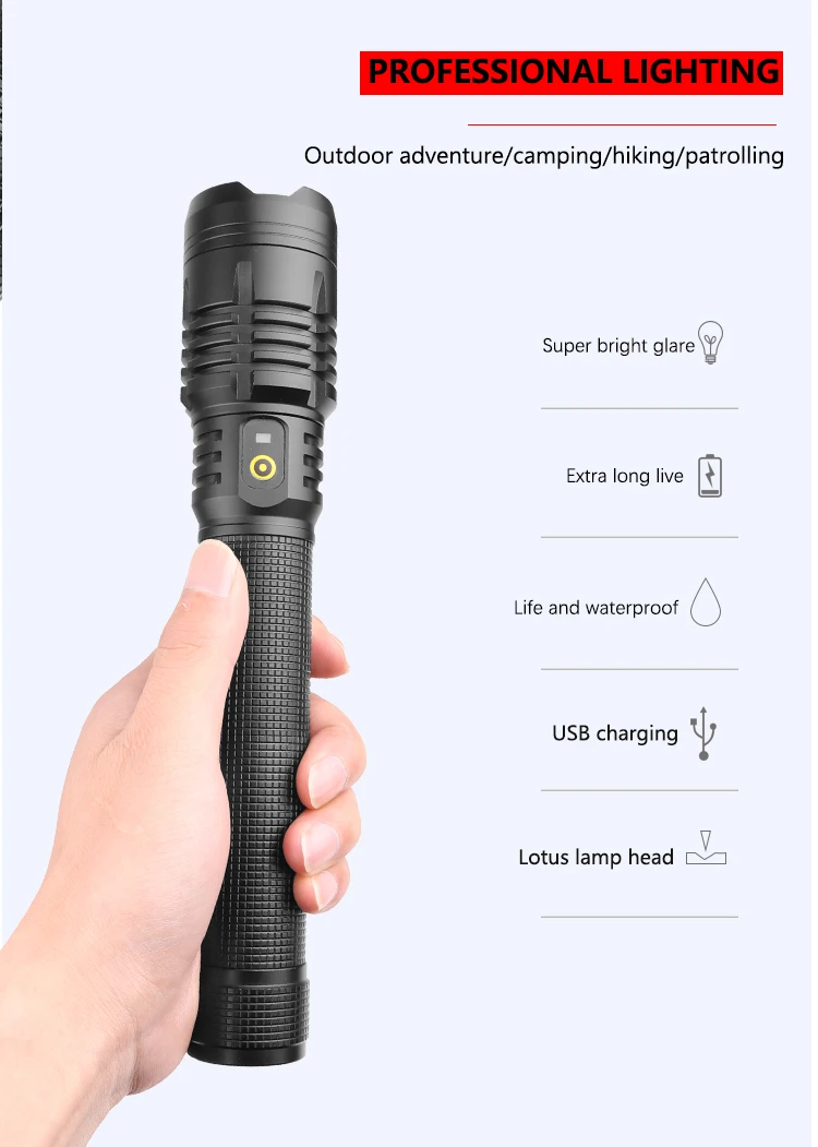 Параметры продукта:Высококачественный светодиодный светильник для вспышки поддерживает расстояние до 656ft с помощью легкого управления, светодиодный, увеличивающий фокусировку головы, и простой режим-переключение на светильник нажатием кнопки; он обеспечивает людям надежный и удобный светильник, идеально подходит для кемпинга, пеших прогулок, езды на велосипеде, домашних аварийных ситуаций или подарков. Надежный, но очень доступный инструмент для сопровождения ваших приключений на открытом воздухе.