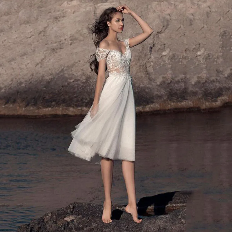 Короткое свадебное платье в стиле бохо с открытыми плечами, Кружевн...