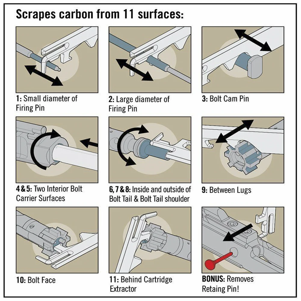 Углерод является врагом оружия.Регулярное использование быстро создает углерод на болтах и кольцах.Движущиеся части требуют точного соскабливания, поэтому мы разработали скребок-Первый скребок предназначен для очистки 12 критических поверхностей на группе болтов.Инновационный двусторонний поворотный дизайн экономит время, быстро и легко удаляя углерод из всей группы болтов.Карбон только что сбегал из мест, где можно спрятаться.