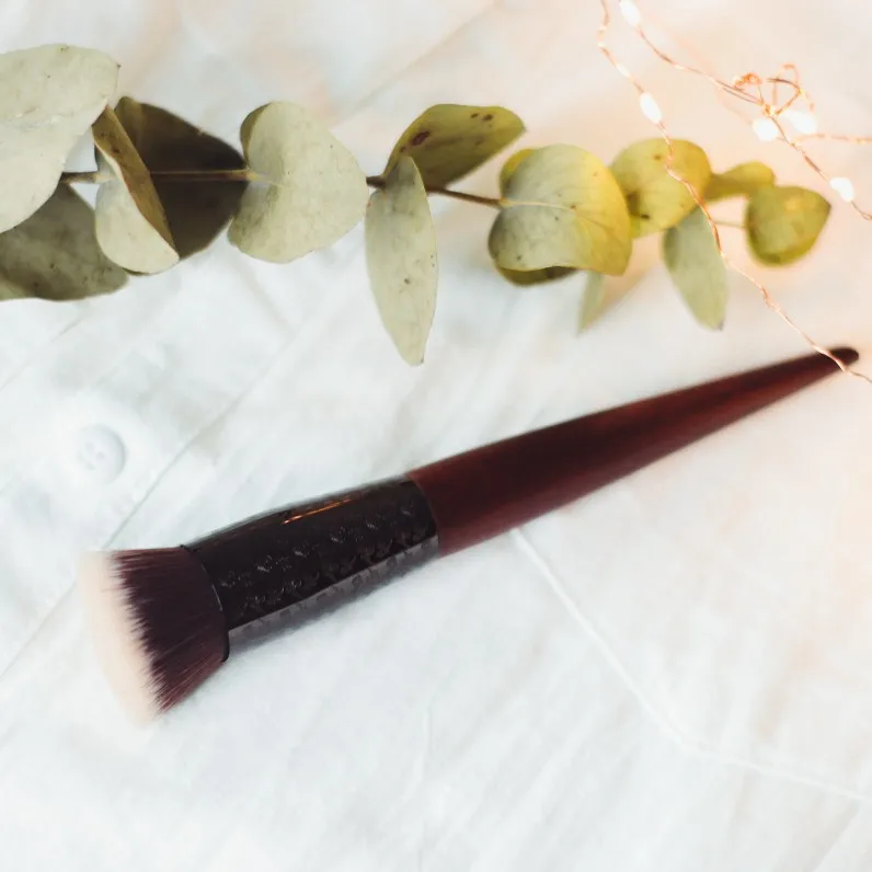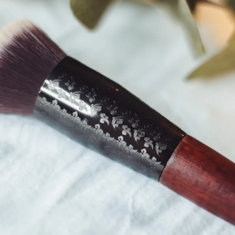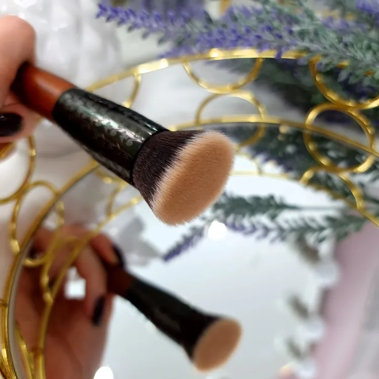 Кисть для нанесения тональной основы. Удобное и ровное нанесение с такой кистью просто обеспечено Приходит в красивой коробочке, пакетике и защитной пленке, но коробка у меня помялась при транспортировке. Кисть с синтетическим ворсом, это даже хорошо, она не впитывает в себя косметику, ровно распределяет и легко моется. Стержень кисти из сандалового дерева, алюминиевая втулка с цветочной гравировкой, ворс плотный и ровный. Качество понравилось