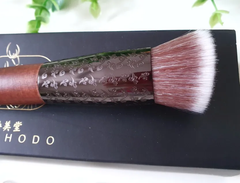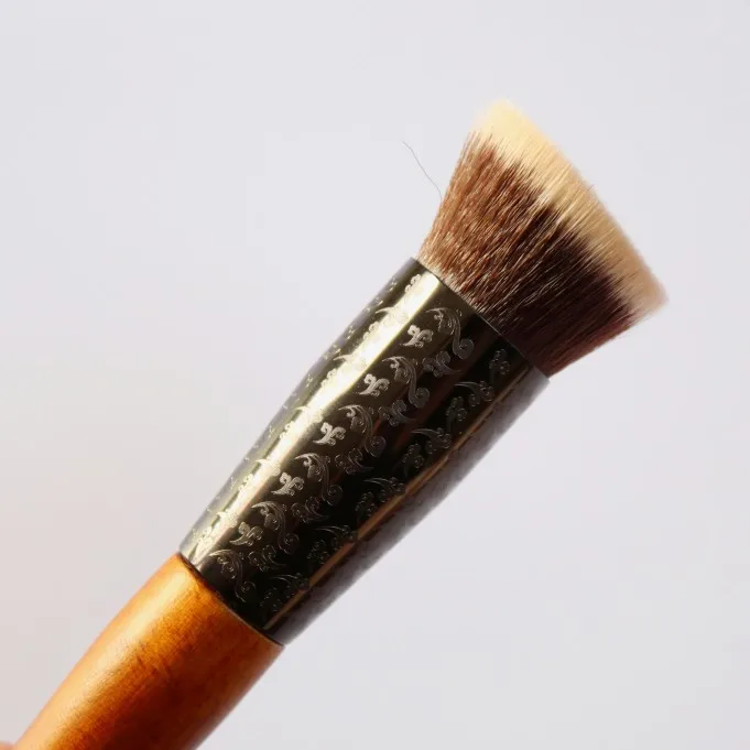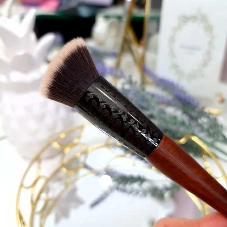 Эта кисть имеет ручку из сандалового дерево с надписью бренда, алюминиевую втулку с красивой цветочной гравировкой и плотно набитый, в меру упругий скошенный ворс. Кисть предназначена для нанесения и растушевки тональной основы, поэтому имеет искусственный ворс -- он не впитывает косметику, дает ровное покрытие и легко моется. Жесткость кисти средняя, волоски пластичные и ровные. Кисть приехала в красивой упаковке за 18 дней