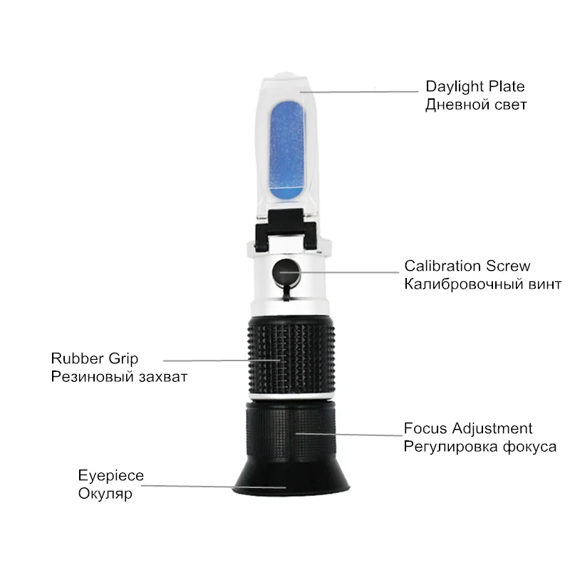 [Прост в использовании] поместите 2 - 3 капли образца на призму, а затем посмотрите через окуляр на показания по шкале Брикса и удельного веса