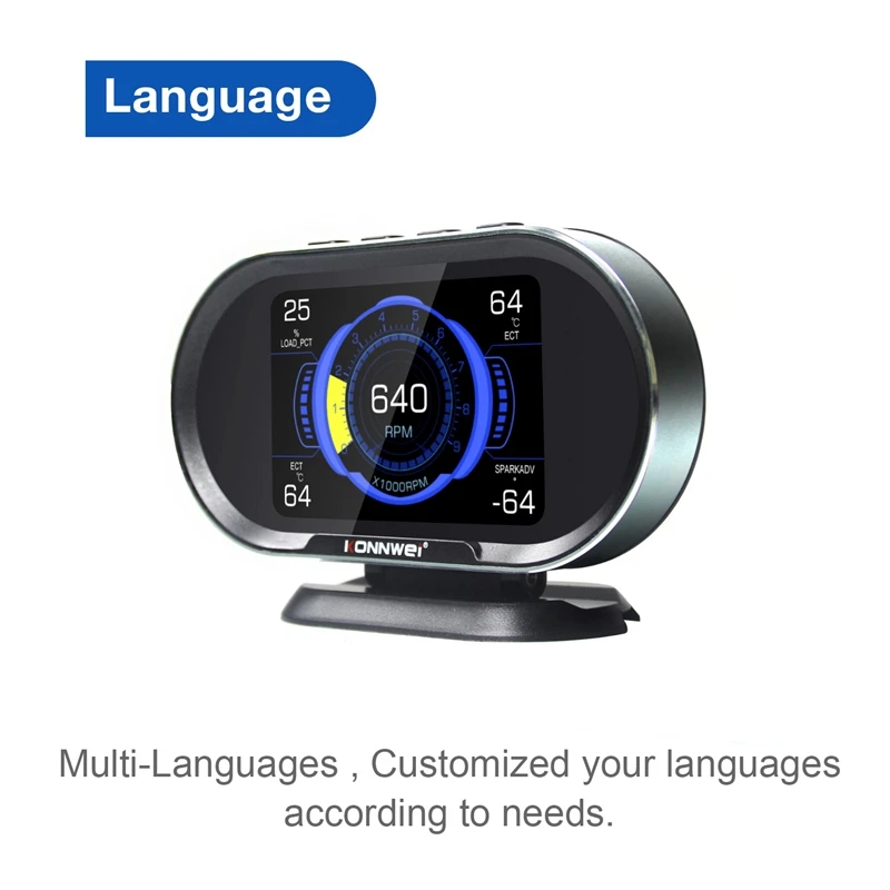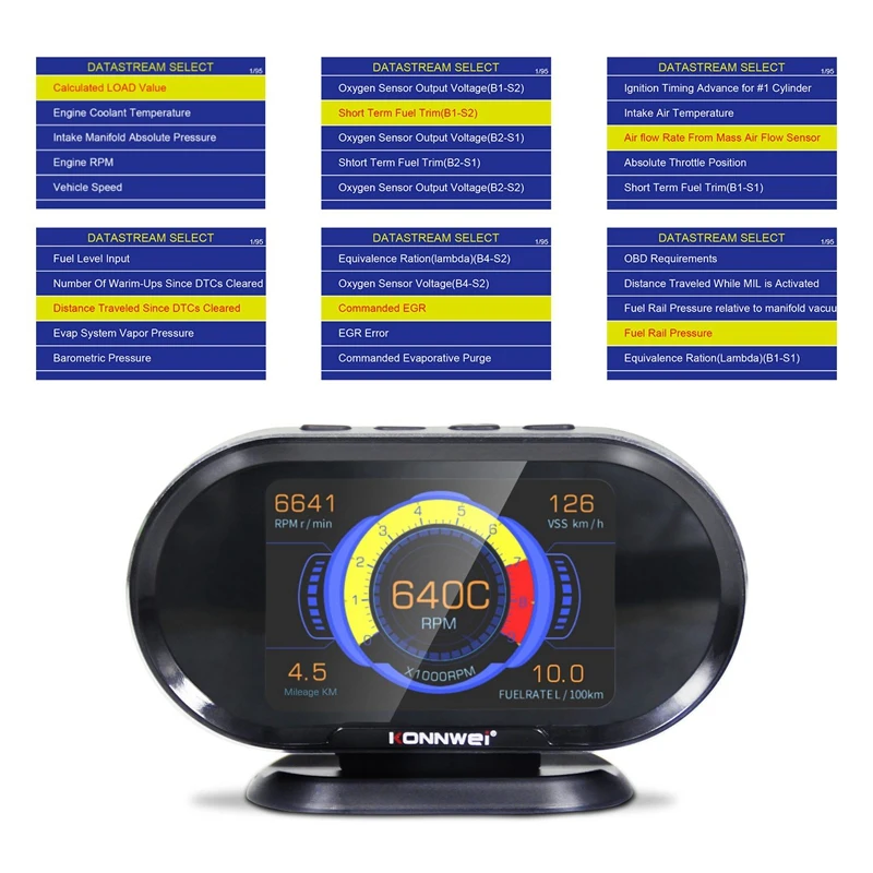 Все в одном OBD2 датчики: KW206 автомобильный OBD2 HUD представляет собой сочетание автомобильного бортового компьютерного датчика и диагностического сканера. Он может отображать до сотен наборов параметров двигателя в реальном времени на цифровом цветном экране 3,5 дюйма, таких как спидометр, об/мин, температура охлаждающей жидкости, расход топлива, уровень топлива... также может считывать коды неисправностей двигателя и выключать светильник проверки двигателя.