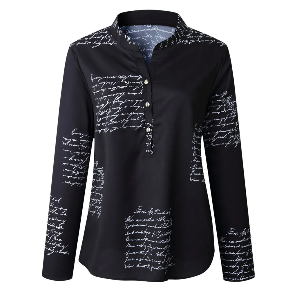 Блузка Осенняя женская обувь; Цвет белый, черный; Блуза с принтом в виде букв на пуговицах с v-образным вырезом, сексуальное, топы, рубашки с длинными рукавами для девочек, весенние Блузы #11