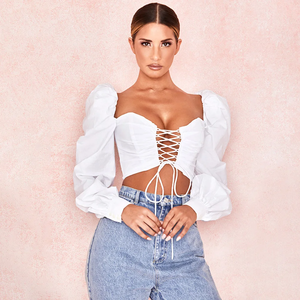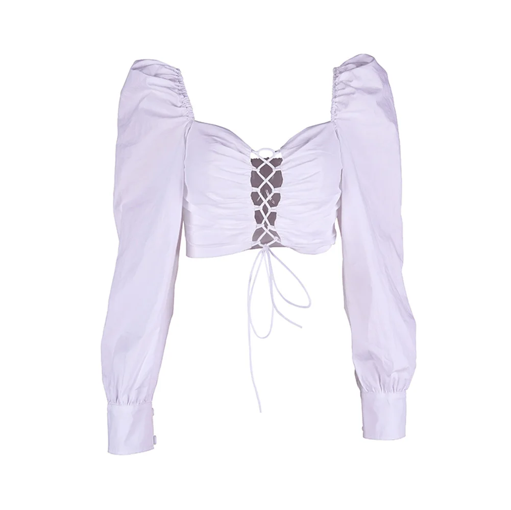 Женская блузка на шнуровке, белая, с пышными рукавами, без бретелек