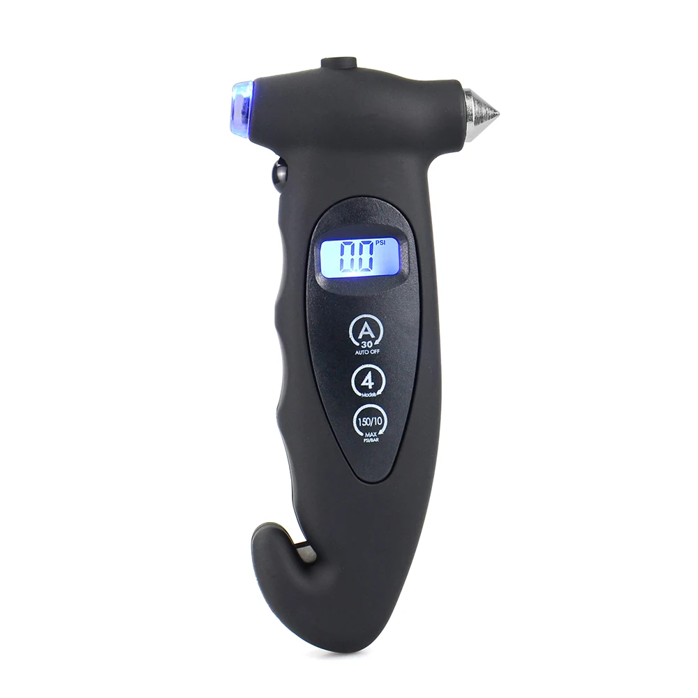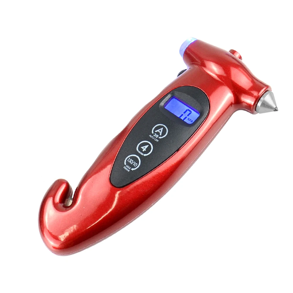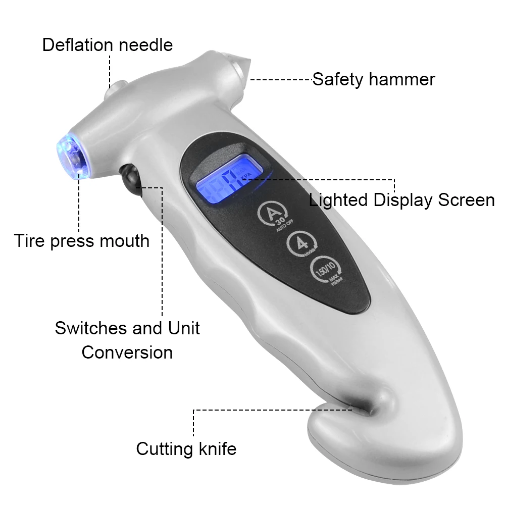 Основная функция:1. Фонарик, аварийное использование;2. Манометр для обеспечения правильного давления в шинах, предотвращения продувки шин и обеспечения безопасности вождения;3. Спасательный молоток, используемый для побега;4. Резак ремня безопасности может быстро отрезать ремень безопасности, что делает безопасность более безопасной.5. Если давление в шинах слишком высокое, сдуйте воздух вовремя, чтобы предотвратить разрыв шин.Диапазон измерения давления: 0-150 фунтов на квадратный дюйм, 0-10 бар, 0-1000 кПа, 0-10 кг/см2Единицы измерения могут быть преобразованы: PSI, BAR, KPA, KG/CM2; Нажмите кнопку питания один раз, чтобы преобразовать устройство. Повторное измерение без сброса. Встроенная 3 AG13 кнопочная электроника, которая используется для 2 лет, и электроника может быть заменена удалением задней крышки. Есть Сертификация CE и сертификация батареи MSDS.Минимальная единица: 0.5PSI/0.05BARТочность: ≤ +/-1,5 psiМощность питания: AG13 * 3, на одной пуговице, электроника 1,5 VКнопка Вкл/Выкл 30 секунд автоматическое Длительное нажатие на 5 секунд ручное выключениеОбычно существует четыре единицы измерения давления воздуха: psi, bar, kPa, kg/ c㎡. Конверсионные отношения между ними:1 бар = 0,069 бар = 6,9 кПа = 0.07c ㎡1 бар = 14,5 фунтов/кв. дюйм = 100 кПа = 1,02 кг/c1 кПа = 0.145psi = 0.01bar = 0,01 кг/c㎡1 кг/c㎡ = 14.22psi = 0.98bar = 98.07kPaБыстрая информацияФункция: Мониторинг давления в шинахЦвет: черный, красный, синий, серебристыйМатериал: ABS корпус стальной молоток и ножДисплей: ЖК-дисплейДиапазон давления: 1-10Bar/0-150PSIРабочая температура: 0-40 ℃Вес: 0,1 кг