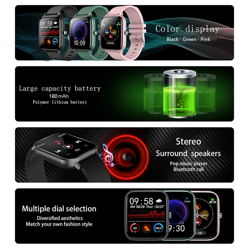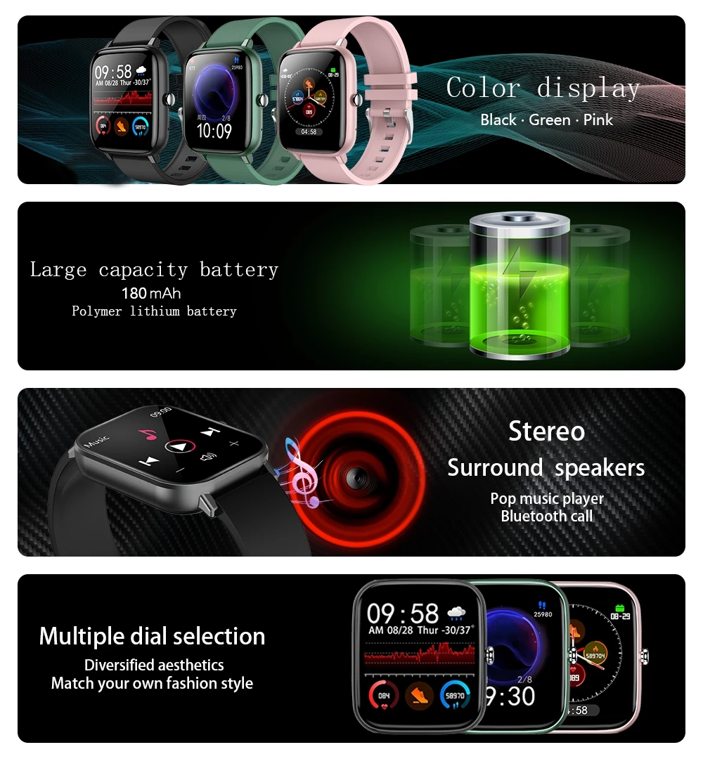 1. Следите за своим здоровьем:Пульс/кровяное давление/мониторинг кислорода в крови, напоминание о сидячем положении, трекер сна.2. Хороший помощник для тренировки:Шагомер, расстояние, сожженные калории, спортивные режимы.3. Хороший помощник для повседневной жизни:Bluetooth телефонные звонки, управление воспроизведением музыки на телефоне, синхронизация уведомлений, напоминание о входящих звонках, будильник, поиск моего устройства, воспроизведение музыки, секундомер, поднятие запястья, будильник, пользовательские часы лица, И т. д.
