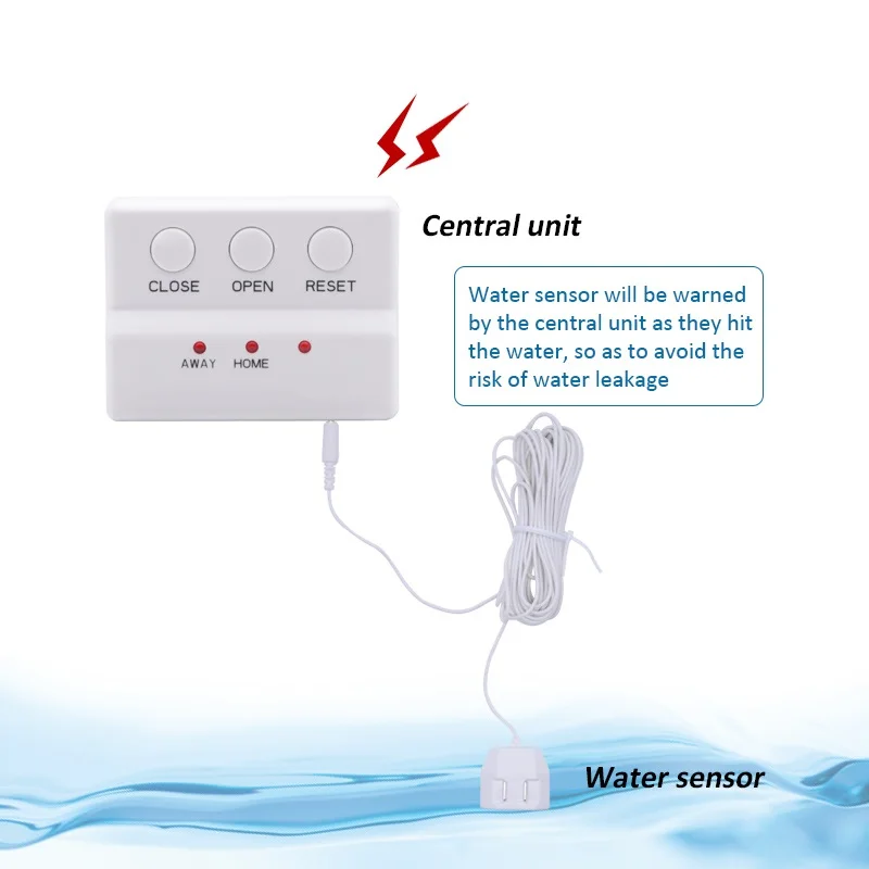 Наша система обнаружения утечки воды может избежать экономичных потерь и расширения повреждений, вызванных утечкой воды. Она будет оповещать и отключать электрический клапан, как только датчик воды обнаружит утечку воды. Клапан может остановить водопровод. Обычно подходит для подземного резервуара высокого здания спа и так далее. Вы также можете размещаться рядом с туалетами, подвалами, стиральными машинами, машинами с кондиционированием воздуха, холодильниками, посудомоечными машинами, раковинами, аквариумами, насосами, водонагревателями и где угодно с потенциальным повреждением воды. Это защищает ваш дом, сохраняя предупреждение об утечке в любом месте, утечка воды является потенциальной опасностью.