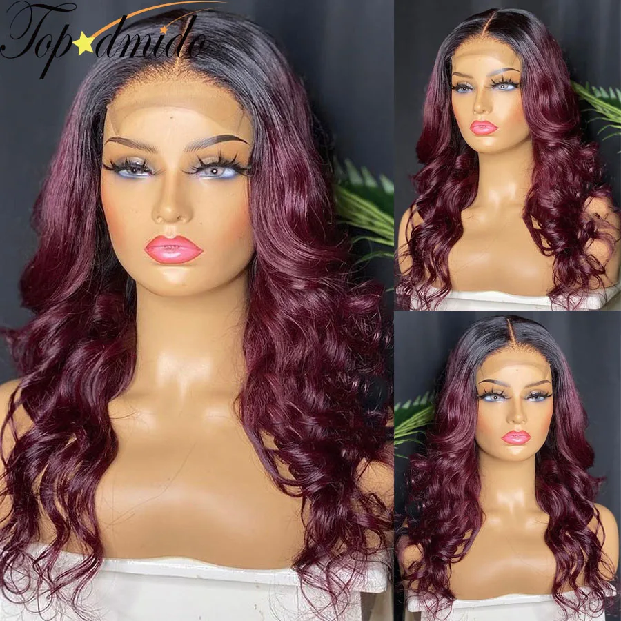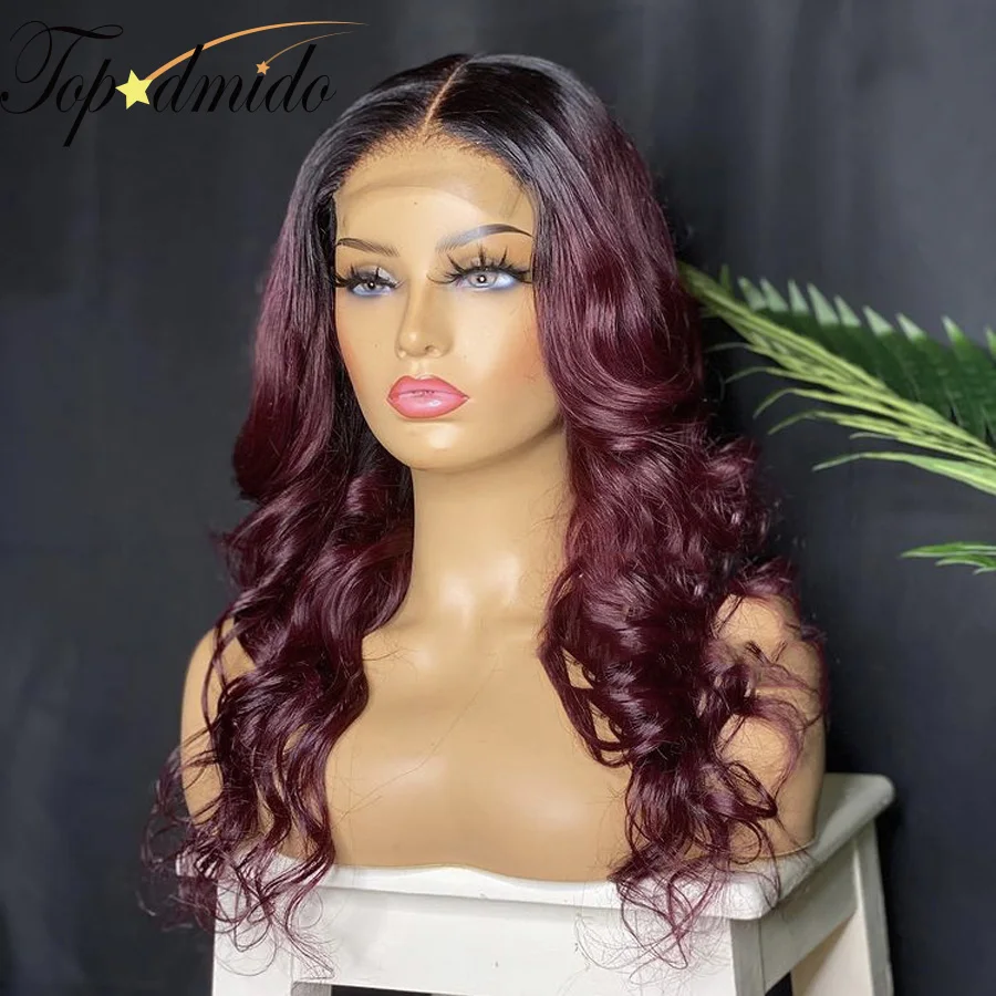 Topodmido 13x4 эффектом деграде (переход от темного к 1B 99j Цвет Синтетические волосы на кружеве парики с детскими волосами предварительно вырезанные Окаймленный парик из бразильских человеческих волос темно-красный бесклеевой парик шнурка