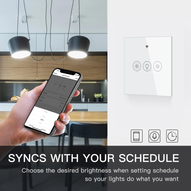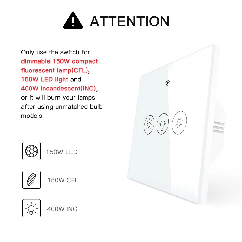 1,2/3-way multi-control association для управления 1 светильник с несколькими переключателями диммера; Панель из закаленного стекла с защитой от царапин подходит для любого домашнего декора и обеспечивает легкое сенсорное управление; вы можете связать этот переключатель с несколькими различными переключателями в приложении Smart Life.