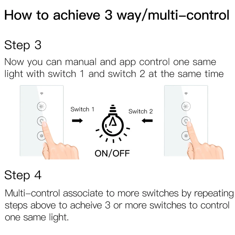 1,2/3-way multi-control association для управления 1 светильник с несколькими переключателями диммера; Панель из закаленного стекла с защитой от царапин подходит для любого домашнего декора и обеспечивает легкое сенсорное управление; вы можете связать этот переключатель с несколькими различными переключателями в приложении Smart Life.