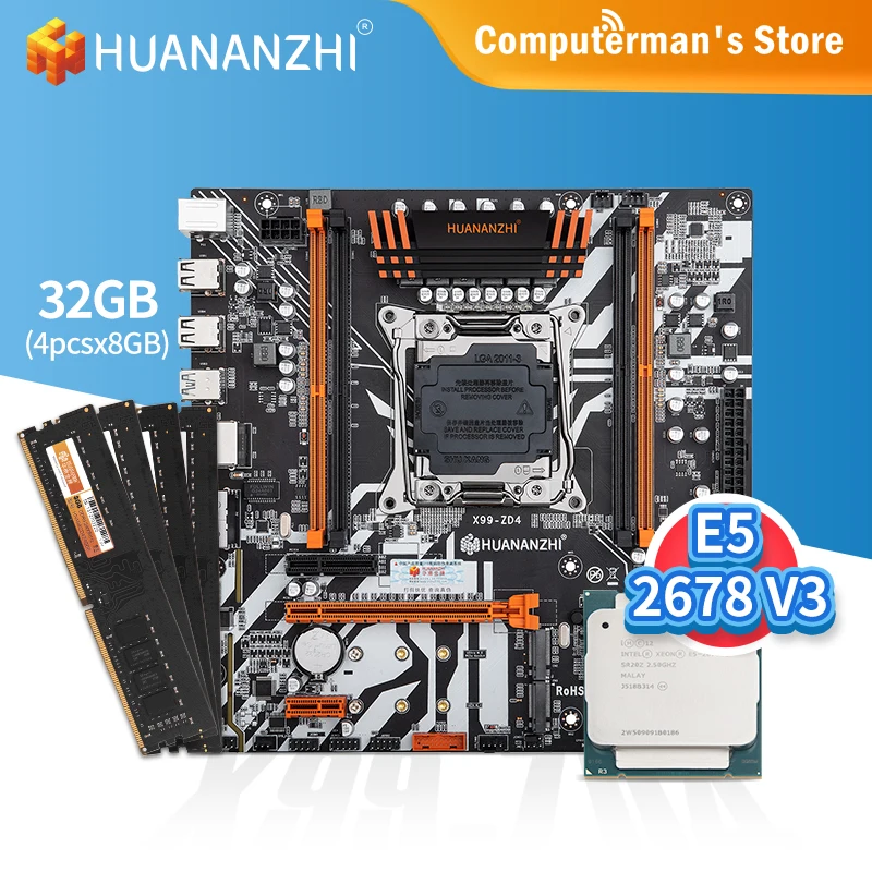 Материнская плата HUANANZHI X99 ZD4 X99 в комплекте с процессором Intel XEON E5 2678 V3, память 4*8 ГБ DDR4 NON-ECC 2400, память M.2 NVME NGFF USB
