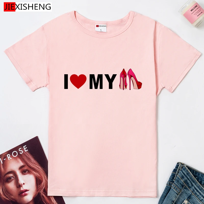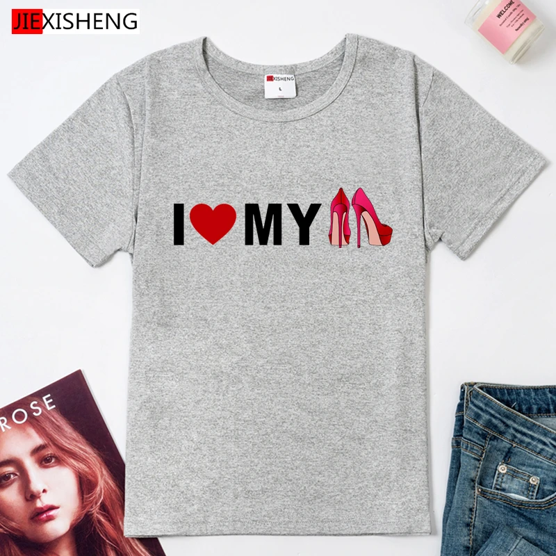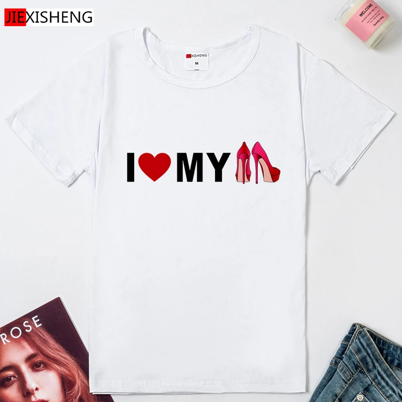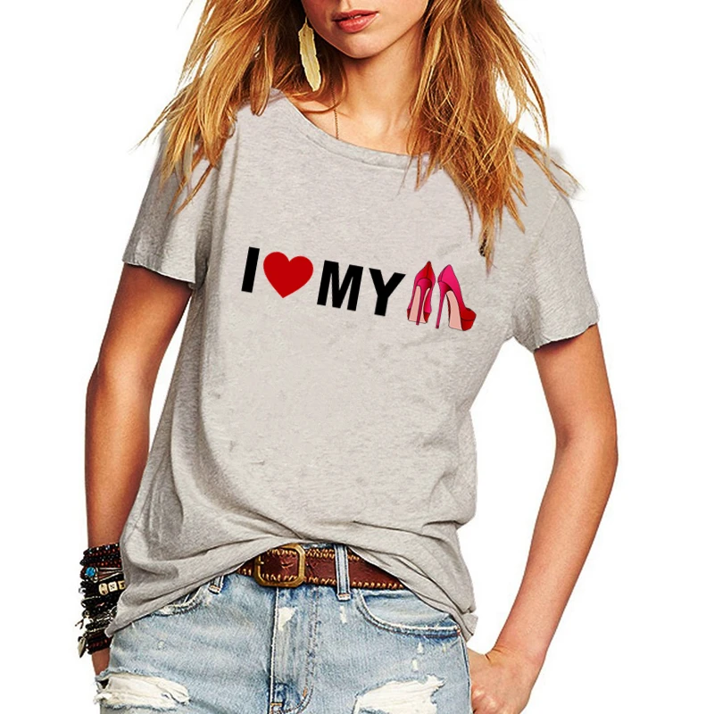 С надписью I Love летние туфли, слипоны, с принтом, женская футболка с принтом модная женская выбор 5 Цвета с коротким рукавом и О-образным вырезом базовые топы Летняя она подходит ко всему