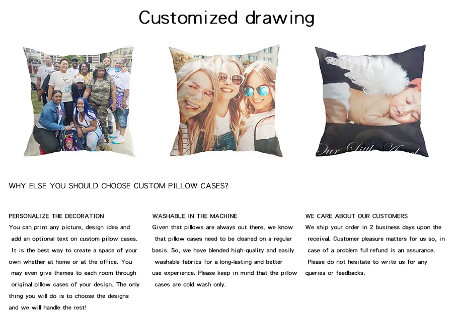 【Персонализированная подушка с фото 】акцентируйте свой дом с помощью пользовательских фото-подушки и сделайте себя завистью по соседству. Изготовленные из высококачественной симплексной трикотажной ткани, эти 100% полиэфирные подушки мягкие и без морщин. Тяжёлый растягивающийся материал обеспечивает красивую цветопередачу вашего дизайна, а также является идеальным дополнением к Вашему дивану!