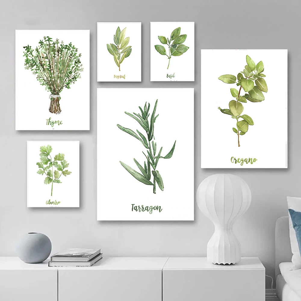 Коллекция трав эвкалипта, кухонные настенные художественные плакаты на холсте и принты, Кинза, орегано, тимьян, ботаническая живопись, картины