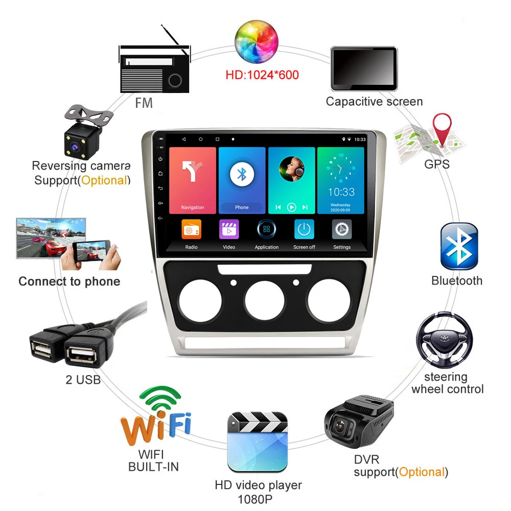CarPlay Автомагнитола Магнитола Автомобильный мультимедийный плеер Eastereggs, 2 Din, 10,1 дюйма, Android, радио для Skoda Octavia 2007-2014, Wi-Fi, GPS-навигация, FM, Bluetooth 2 дин андройд Аудио Автомагнитолы