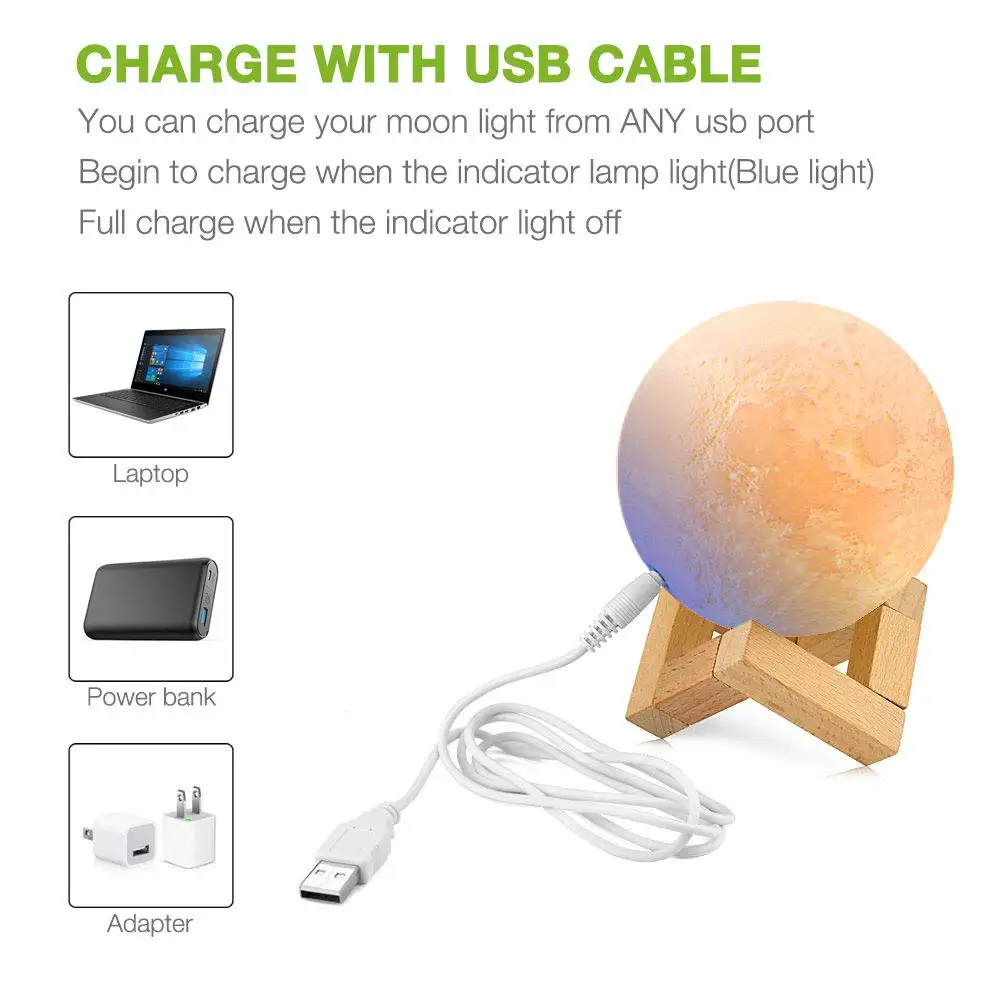 Лунный светильник со встроенной перезаряжаемой батареей, может заряжаться на вашем компьютере/портативном зарядном устройстве или адаптере зарядки и т. д. без висящей линии, вы можете держать лунный свет на руке.