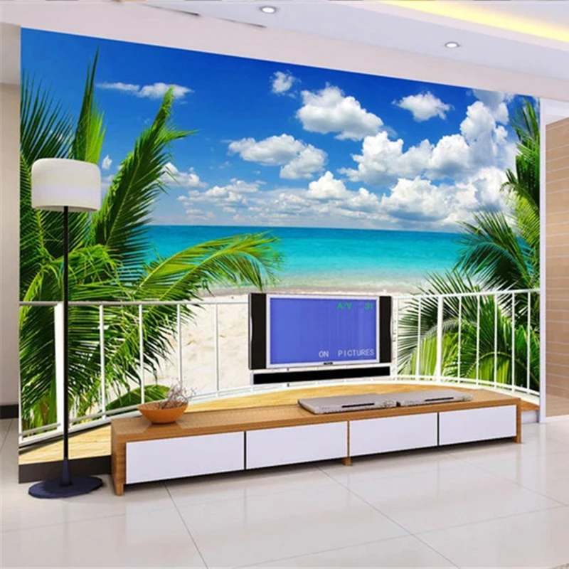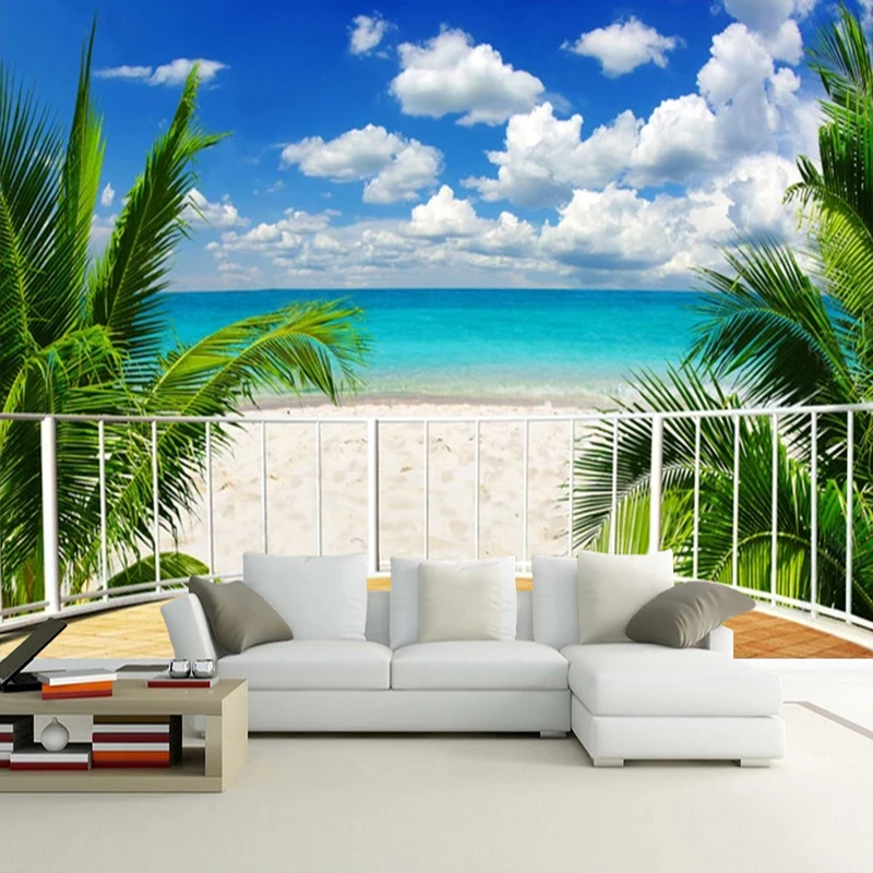 Обои на заказ для стен, 3D балкона, окна, пляж, морской волны, Фото...