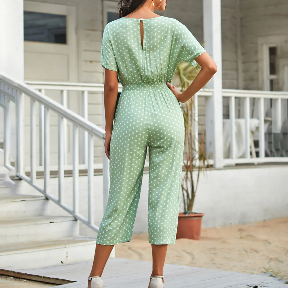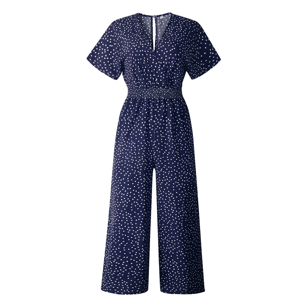 Женский хлопковый комбинезон в горошек, повседневный комбинезон с глубоким V-образным вырезом и карманами, одежда с принтом, комбинезон с короткими рукавами и широкими штанинами, лето 2021