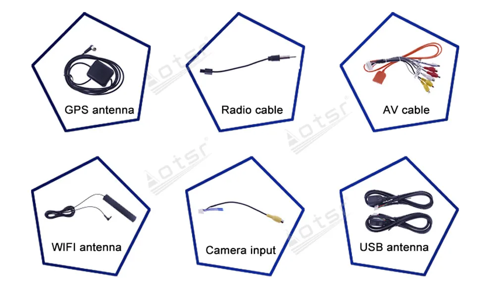 Наш продукт поставляется с GPS антенной, gps-картой для вашей страны, usb-адаптером, аудио и видео входным кабелем, кабелем питания... и т. д., все наборы для установки будут в посылка.