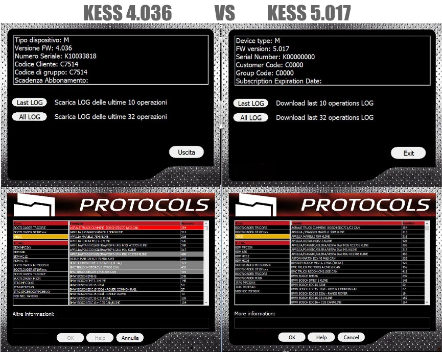 KESS V5.017 поддерживает некоторые грузовики/тракторы/мотоциклы, но V7.020 поддерживает гораздо больше грузовиков/тракторов/мотоциклов и лучше подходит для дизельных автомобилей, чем KESS V5.017!