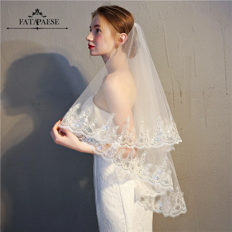 Элегантная двухслойная кружевная свадебная фата, 2-ярусная короткая...
