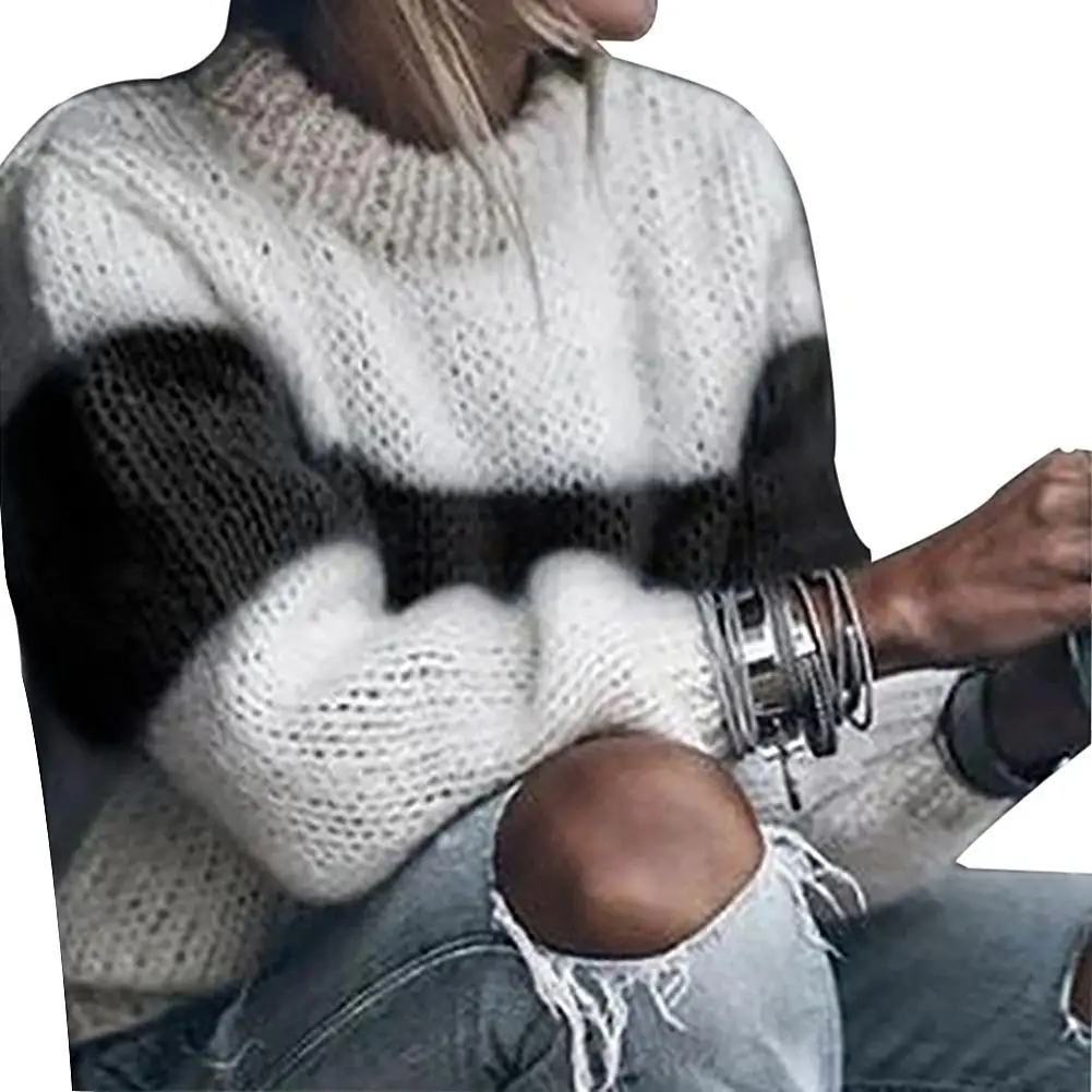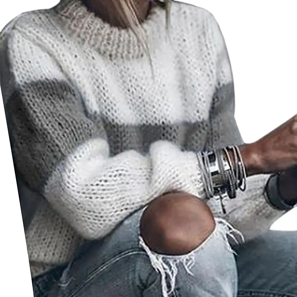 Повседневный женский осенне-зимний Свободный вязаный свитер с круглым вырезом и цветными вставками в стиле пэчворк
