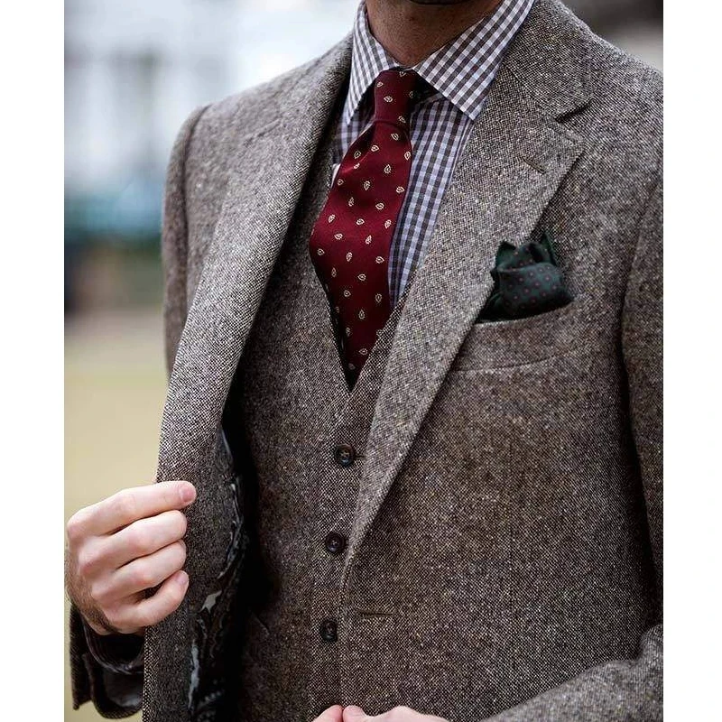 Мужские костюмы из коричневого твида на осень и зиму, плотный костюм из 3 предметов в стиле пэчворк, мужские свадебные приталенные смокинги для жениха, теплый костюм, комплект