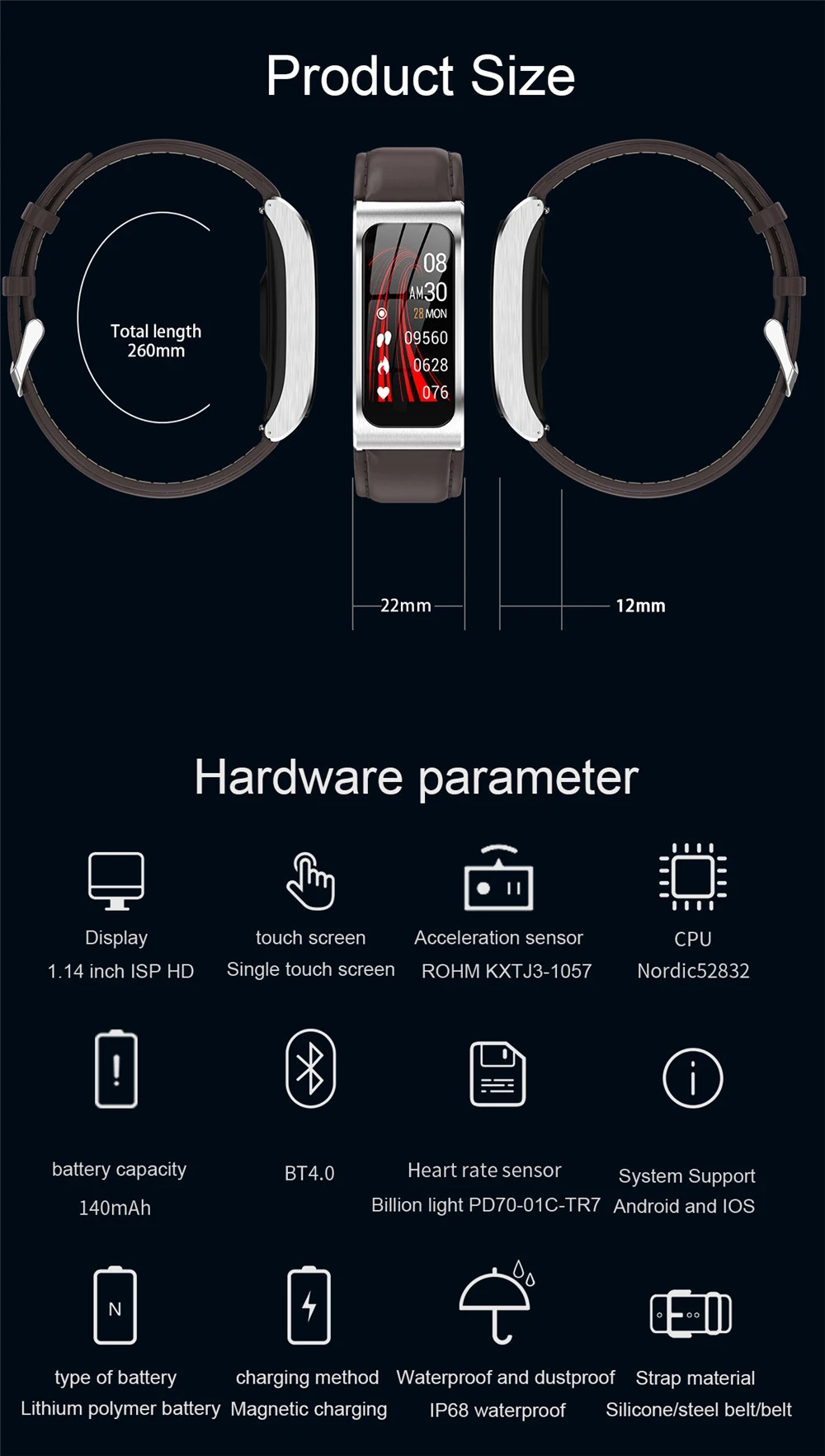 Особенности:Точки пули:1. Точные спортивные данныеМониторинг: упражнения-это не только ваше здоровье. Крутые записи бегаКоличество шагов, понимание расстояния и развитие лучшеПривычки.2. Рассчитать шаг: шаги, калории, расстояние, независимо от срока службыИ работайте, занимайтесь спортом и расслабляйтесь, Контролируйте и тренируйте большеЭффективно.3. Водонепроницаемость IP68: водонепроницаемый и пыленепроницаемый,Защита от ветра и дождя, не боится дождя.4. Информация в реальном времениНапоминание, интимный помощник: WeChat QQ SMS напоминание о вибрации, даже еслиМобильный телефон не вокруг, вы можете проверить новости вовремя, не пропуститеВажная информация.5. Мониторинг здоровья: Измерьте пульс,Измерять кровяное давление,