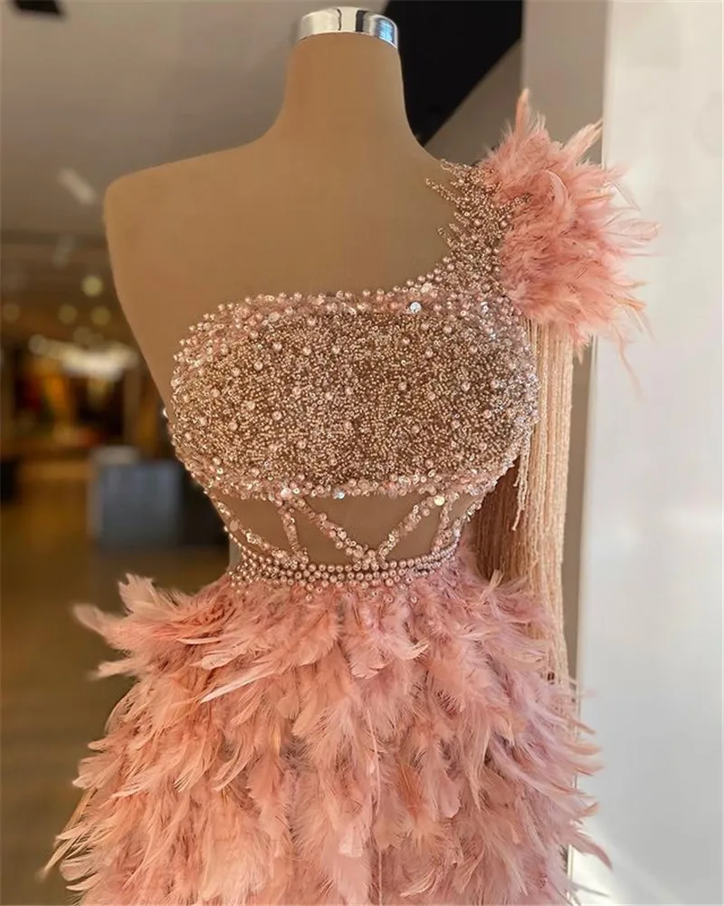 Шикарное короткое платье для выпускного вечера с перьями для девочек, на одно плечо, с блестящими кисточками, платье для выпускного вечера на заказ, коктейльное платье с вышивкой бисером