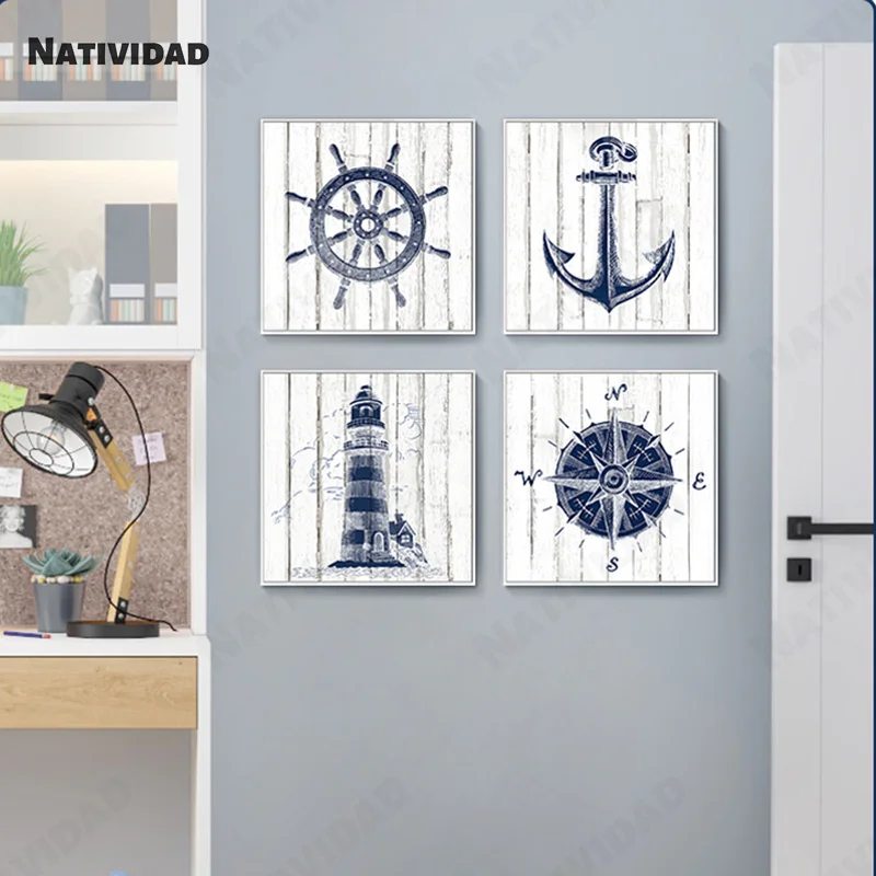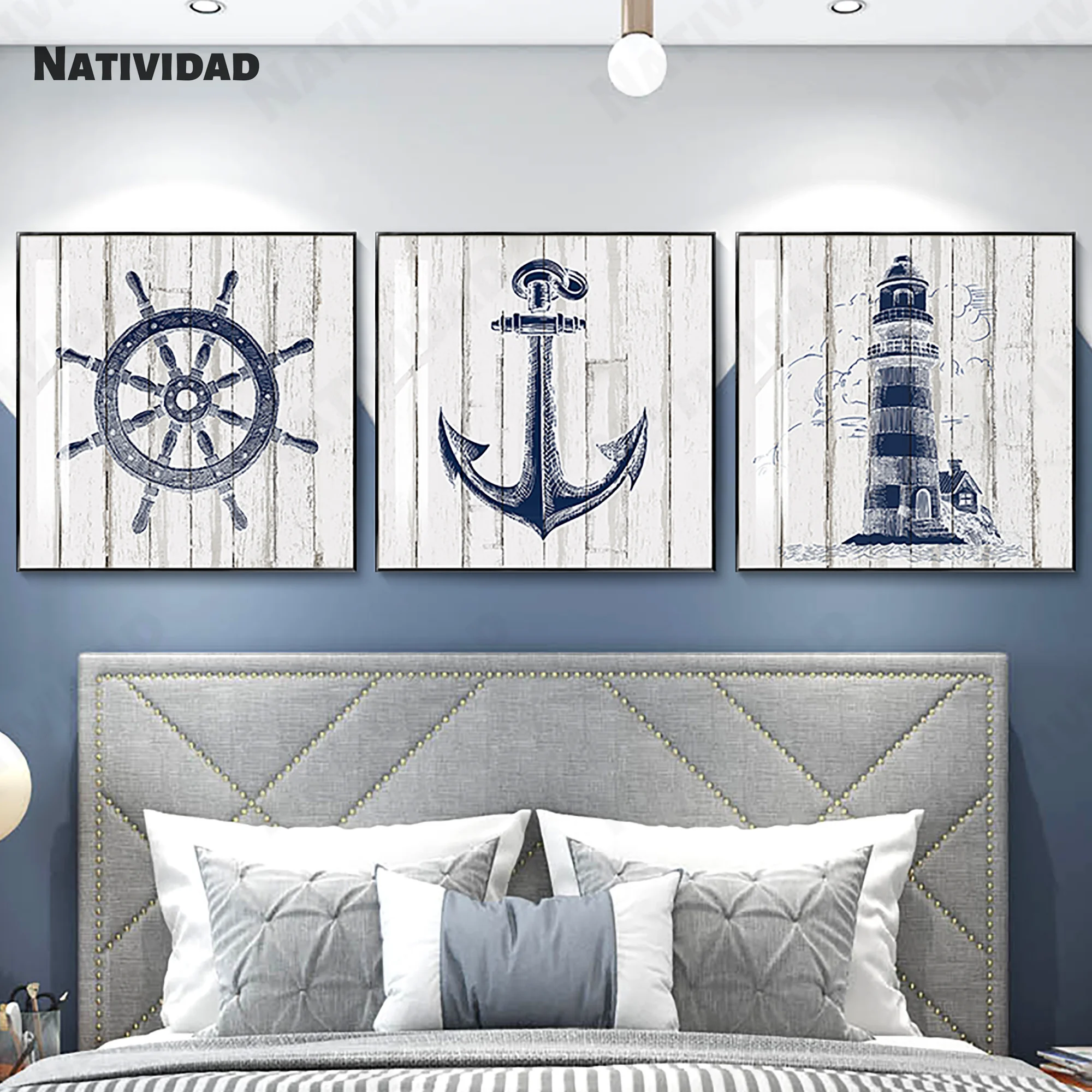 Морская схема окраски Маяк Холст Картина Темно-Синий компас якорь плакат Средиземноморский мальчик комната Домашний декор искусство