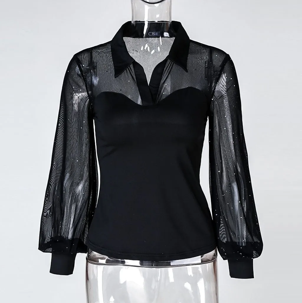 Женская сетчатая блузка с блестками, Топ с длинным рукавом и V-образным вырезом в горошек, повседневные блузки, рубашка, женская блузка 40 #