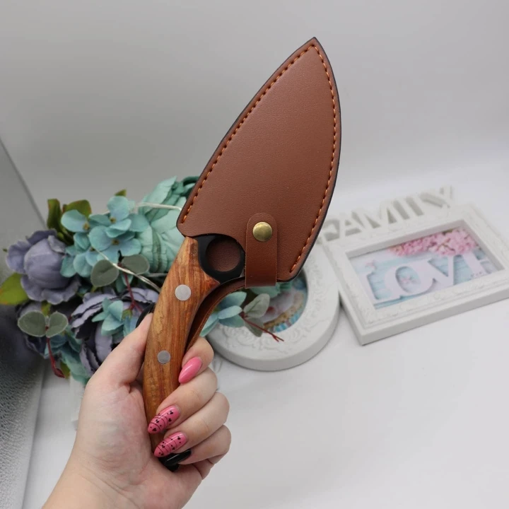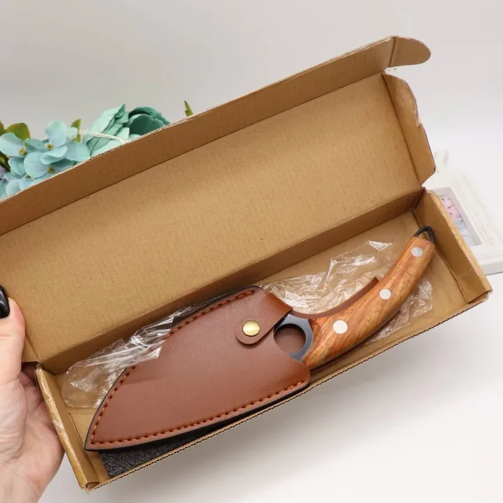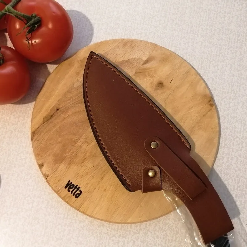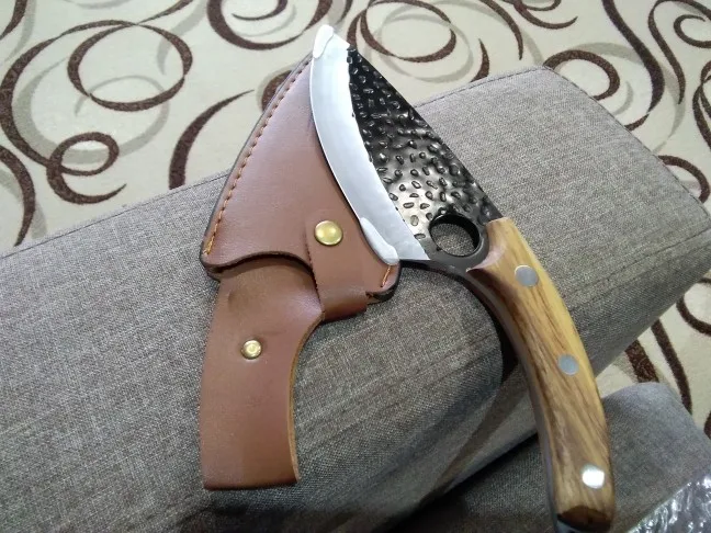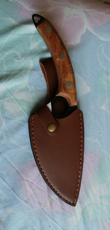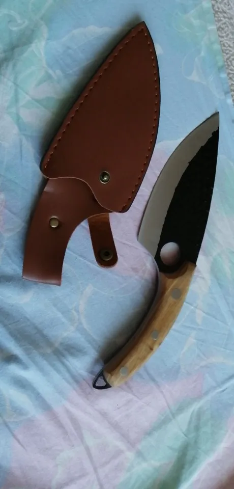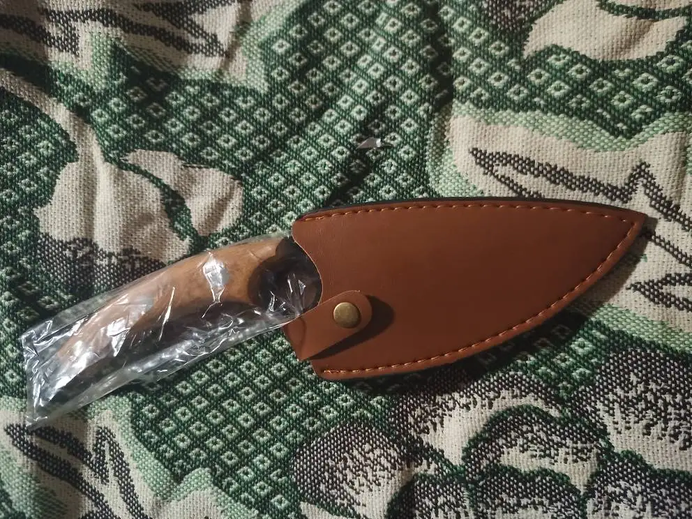 Нож в чехле. Острый, как бритва, аккуратный нож . Доставка заняла больше двух недель. Нож был упакован в коробку. Внутри лежал пластиковый ограничитель или( заглушка) на кончик ножа, для сохранности ножа при транспортировке. Материал нер. сталь. Нож увесистый. Даже на маленькой руке держать этот нож удобно. Рукаятка ножа выполнена из дерева и лакерованна. Это огромный плюс. Так как если деревянная рукаятка не лакерованна , то при контакте с водой выходили на рукоятке деревянные заусеницы, и в итоге палец в занозе. Супер хорошо этот нож продуман. Рукоятка пролакерована. Нож острый, очень. Дизайн обалденный. Режит и мясо, и фрукты и овощи, хлеб и разные выпечки на красивые, ровные, тонкие долечки. Я конечно же буду пользоваться этим ножом, мне очень нравится. Рекомендую