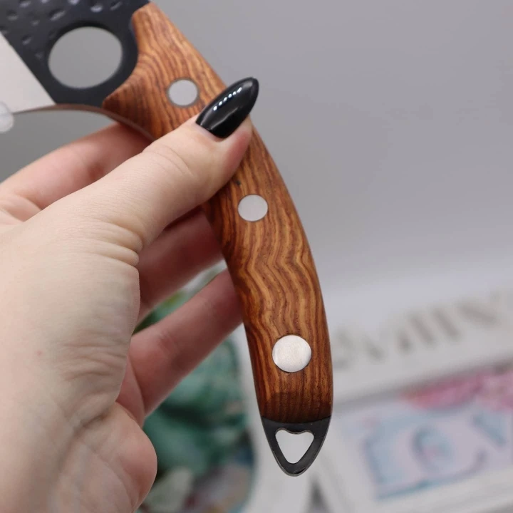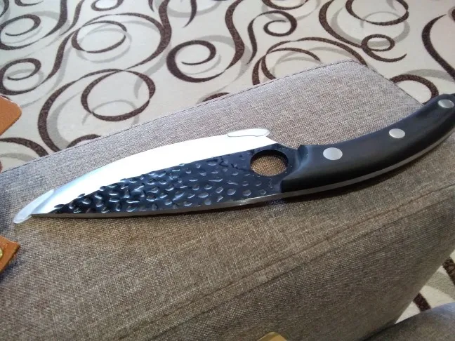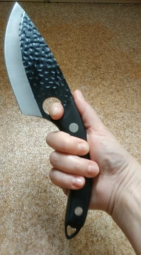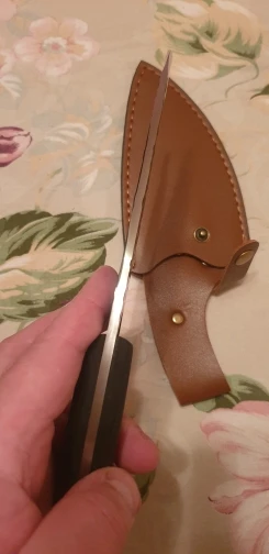 Отличный острый нож. Удобная форма дугой обеспечивает отличные рубящие качества. Запросто разделает крупную рыбину на уху, нарежет картофель, тонко нашинкует помидорки. Из руки не выскользнет, так как на клинке очень удачно имеется сквозной упор для указательного пальца. На торце рукояти предусмотрена петля-отверстие для темляка. Легко настрогает хамон. Бритвенная острота при родной заточке. Для хранения/ ношения имеются отличные жёсткие ножны-чехол из эко-кожи (не садятся), крепятся на ремень.