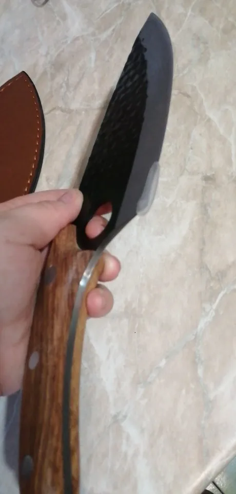 Острый нож, работать с таким одно удовольствие. Довольно увесистый. Металлическая пластина идёт по всей длине ножа. Лезвие очень острое и толстое. Накладки на рукоятке из натурального дерева. Выполнение добротное, придраться не к чему. Нож имеет отверстие на ручке чтобы была возможность его подвесить. Нож понравился, качество хорошее. Можно брать на подарок. Чехол на мой взгляд стоит брать,удобно если брать нож собой например в лес.