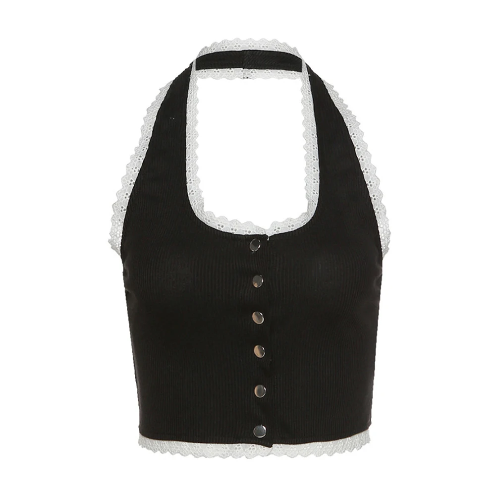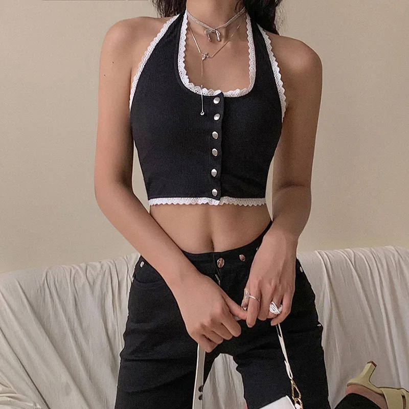 Милая E-girl укороченные топы на бретельках Y2k кружевной подол Лоскутная Сексуальная майка с пуговицами трикотажная черная или серая женская летняя одежда